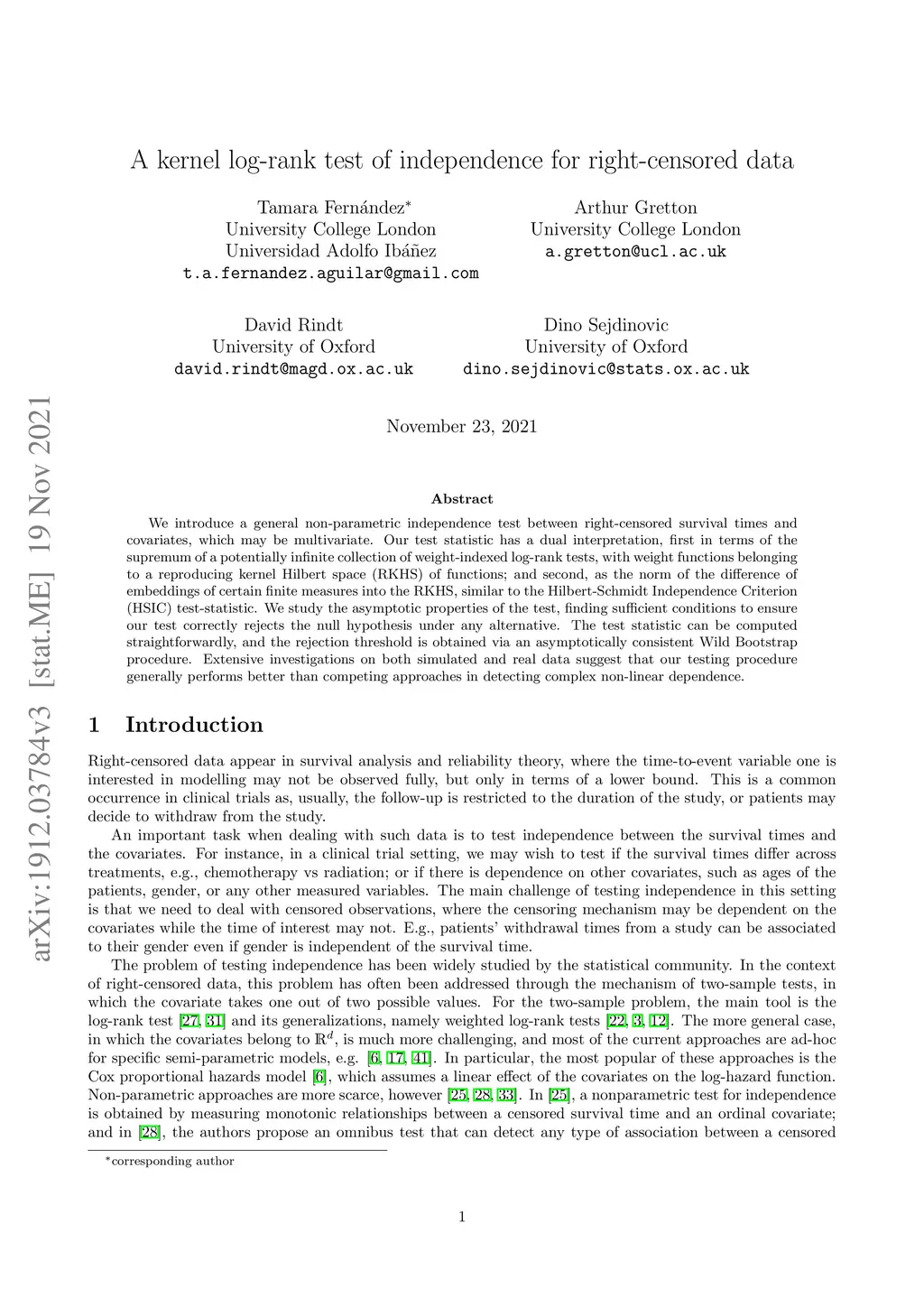 We introduce a general non-parametric independence test between right-censored survival times and covariates, which may be multivariate. Our test statistic has a dual interpretation, first in terms of the supremum of a potentially infinite collection of weight-indexed log-rank tests, with weight functions belonging to a reproducing kernel Hilbert space (RKHS) of functions; and second, as the norm of the difference of embeddings of certain finite measures into the RKHS, similar to the Hilbert-Schmidt Independence Criterion (HSIC) test-statistic. We study the asymptotic properties of the test, finding sufficient conditions to ensure our test correctly rejects the null hypothesis under any alternative. The test statistic can be computed straightforwardly, and the rejection threshold is obtained via an asymptotically consistent Wild Bootstrap procedure. Extensive investigations on both simulated and real data suggest that our testing procedure generally performs better than competing approaches in detecting complex non-linear dependence.