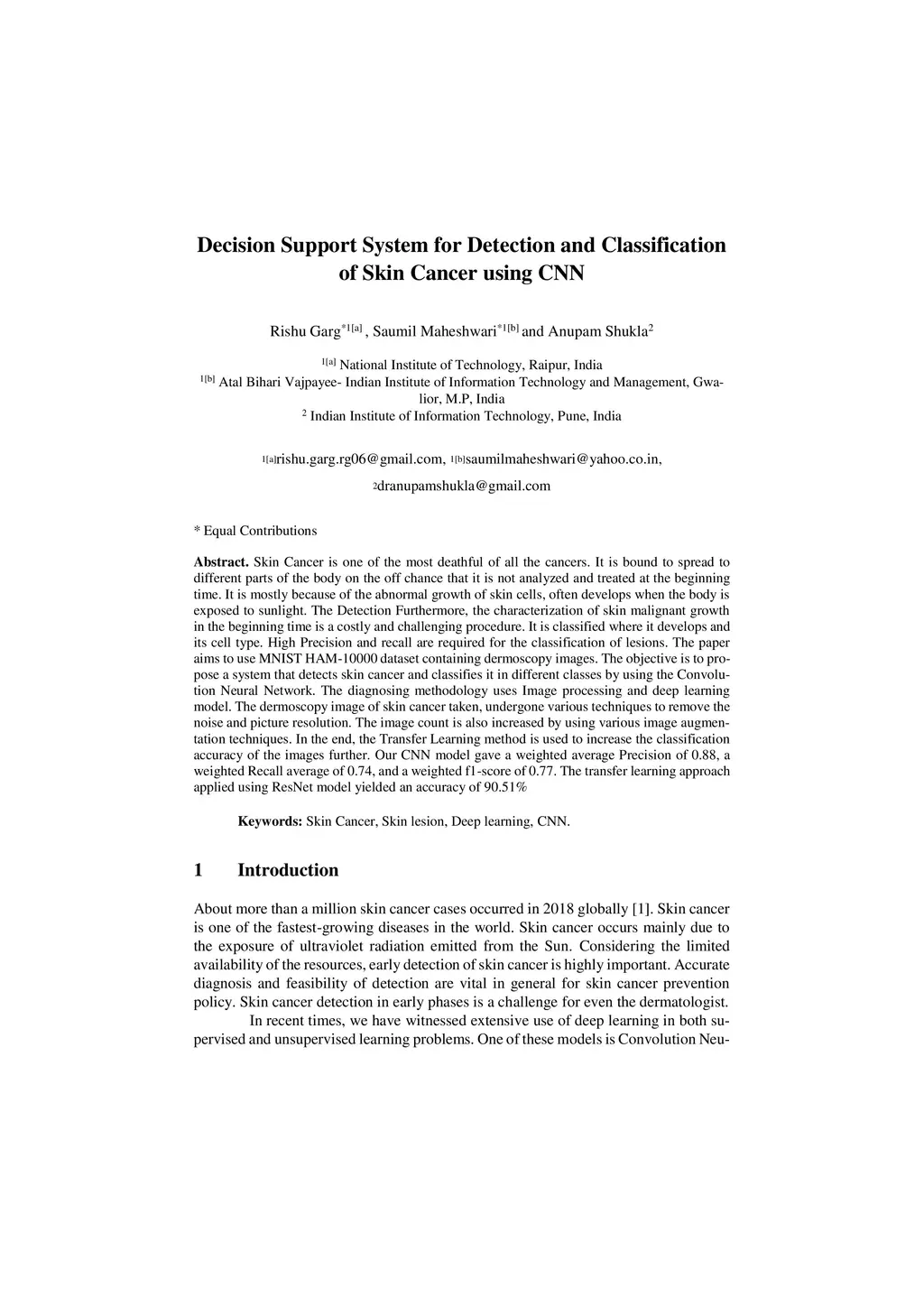 Skin Cancer is one of the most deathful of all the cancers. It is bound to spread to different parts of the body on the off chance that it is not analyzed and treated at the beginning time. It is mostly because of the abnormal growth of skin cells, often develops when the body is exposed to sunlight. The Detection Furthermore, the characterization of skin malignant growth in the beginning time is a costly and challenging procedure. It is classified where it develops and its cell type. High Precision and recall are required for the classification of lesions. The paper aims to use MNIST HAM-10000 dataset containing dermoscopy images. The objective is to propose a system that detects skin cancer and classifies it in different classes by using the Convolution Neural Network. The diagnosing methodology uses Image processing and deep learning model. The dermoscopy image of skin cancer taken, undergone various techniques to remove the noise and picture resolution. The image count is also increased by using various image augmentation techniques. In the end, the Transfer Learning method is used to increase the classification accuracy of the images further. Our CNN model gave a weighted average Precision of 0.88, a weighted Recall average of 0.74, and a weighted f1-score of 0.77. The transfer learning approach applied using ResNet model yielded an accuracy of 90.51%