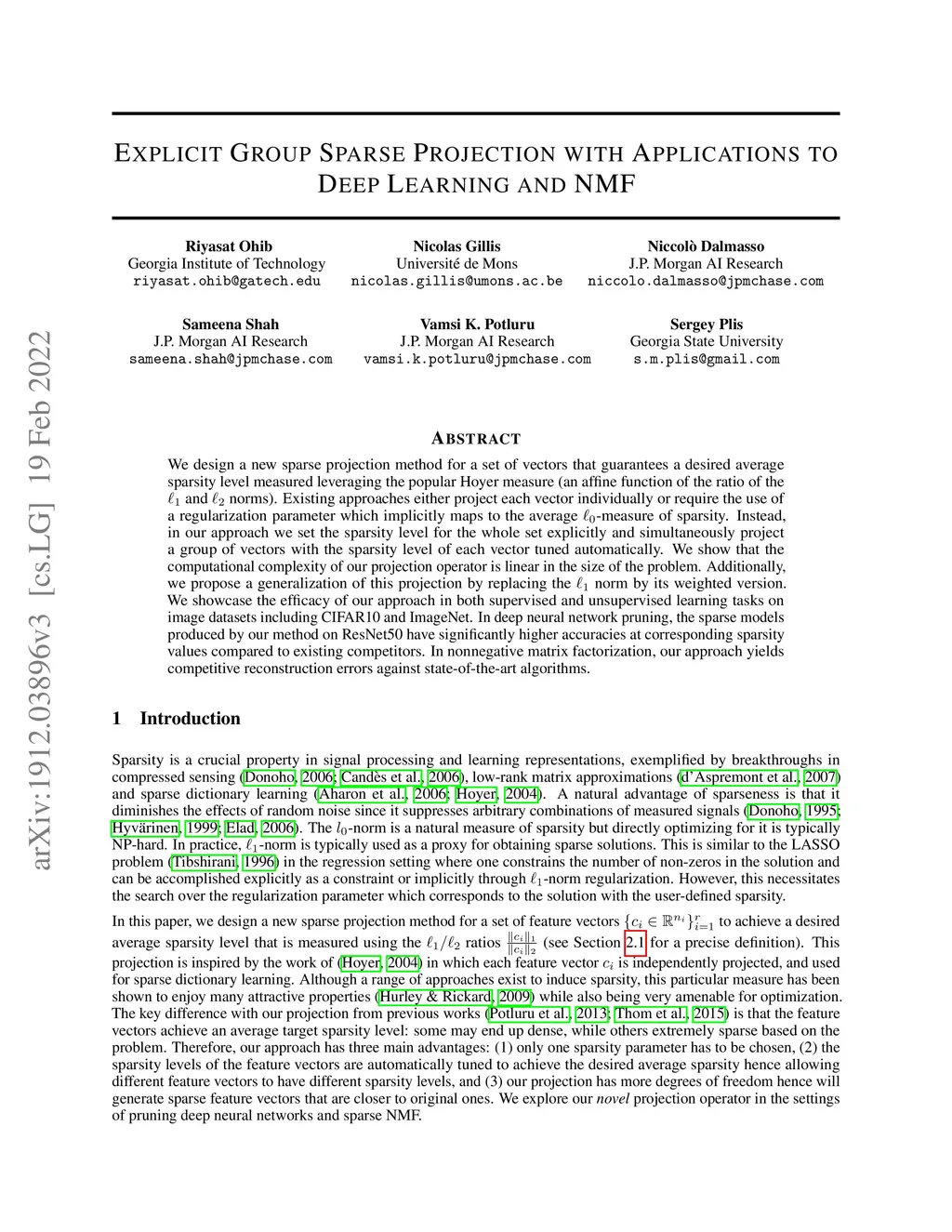 We design a new sparse projection method for a set of vectors that guarantees a desired average sparsity level measured leveraging the popular Hoyer measure (an affine function of the ratio of the and norms). Existing approaches either project each vector individually or require the use of a regularization parameter which implicitly maps to the average -measure of sparsity. Instead, in our approach we set the sparsity level for the whole set explicitly and simultaneously project a group of vectors with the sparsity level of each vector tuned automatically. We show that the computational complexity of our projection operator is linear in the size of the problem. Additionally, we propose a generalization of this projection by replacing the norm by its weighted version. We showcase the efficacy of our approach in both supervised and unsupervised learning tasks on image datasets including CIFAR10 and ImageNet. In deep neural network pruning, the sparse models produced by our method on ResNet50 have significantly higher accuracies at corresponding sparsity values compared to existing competitors. In nonnegative matrix factorization, our approach yields competitive reconstruction errors against state-of-the-art algorithms.