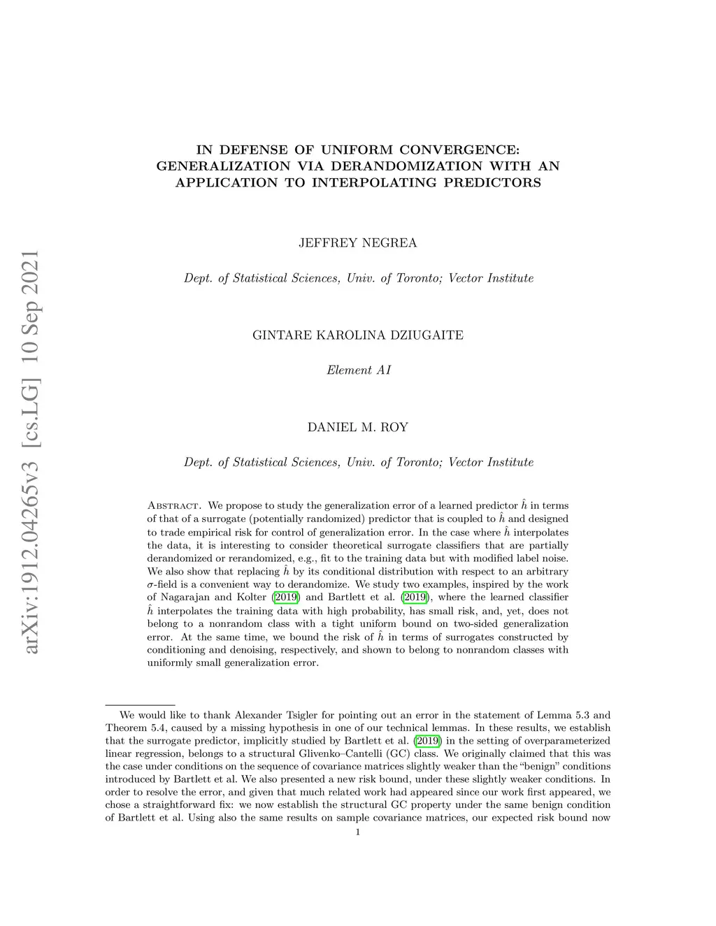 We propose to study the generalization error of a learned predictor in terms of that of a surrogate (potentially randomized) predictor that is coupled to and designed to trade empirical risk for control of generalization error. In the case where interpolates the data, it is interesting to consider theoretical surrogate classifiers that are partially derandomized or rerandomized, e.g., fit to the training data but with modified label noise. We also show that replacing by its conditional distribution with respect to an arbitrary -field is a convenient way to derandomize. We study two examples, inspired by the work of Nagarajan and Kolter (2019) and Bartlett et al. (2019), where the learned classifier interpolates the training data with high probability, has small risk, and, yet, does not belong to a nonrandom class with a tight uniform bound on two-sided generalization error. At the same time, we bound the risk of in terms of surrogates constructed by conditioning and denoising, respectively, and shown to belong to nonrandom classes with uniformly small generalization error.