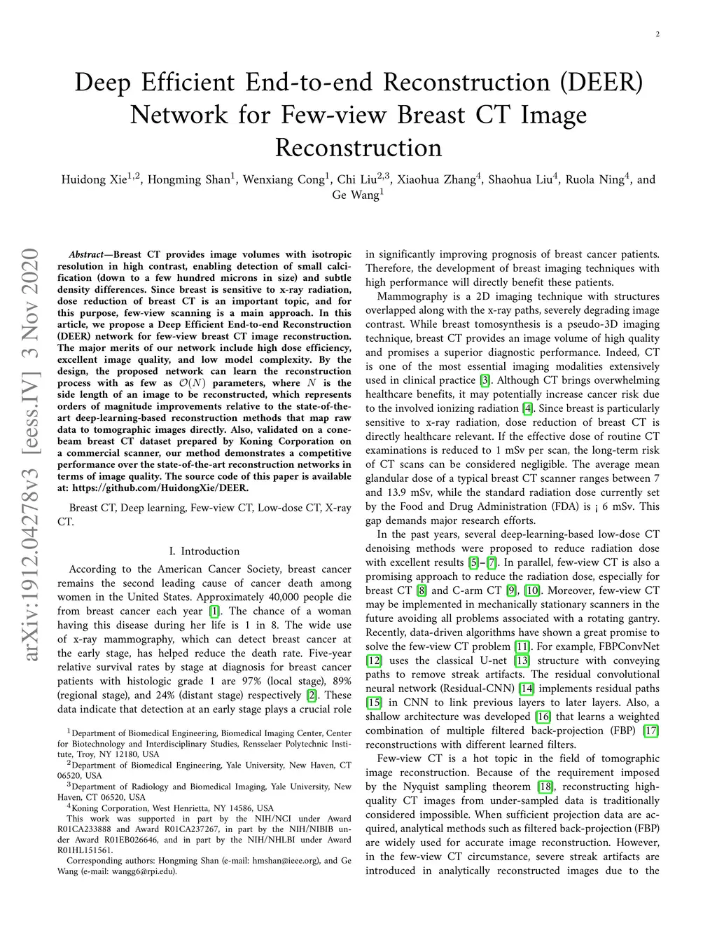 Deep Efficient End-to-end Reconstruction (DEER) Network for Few-view