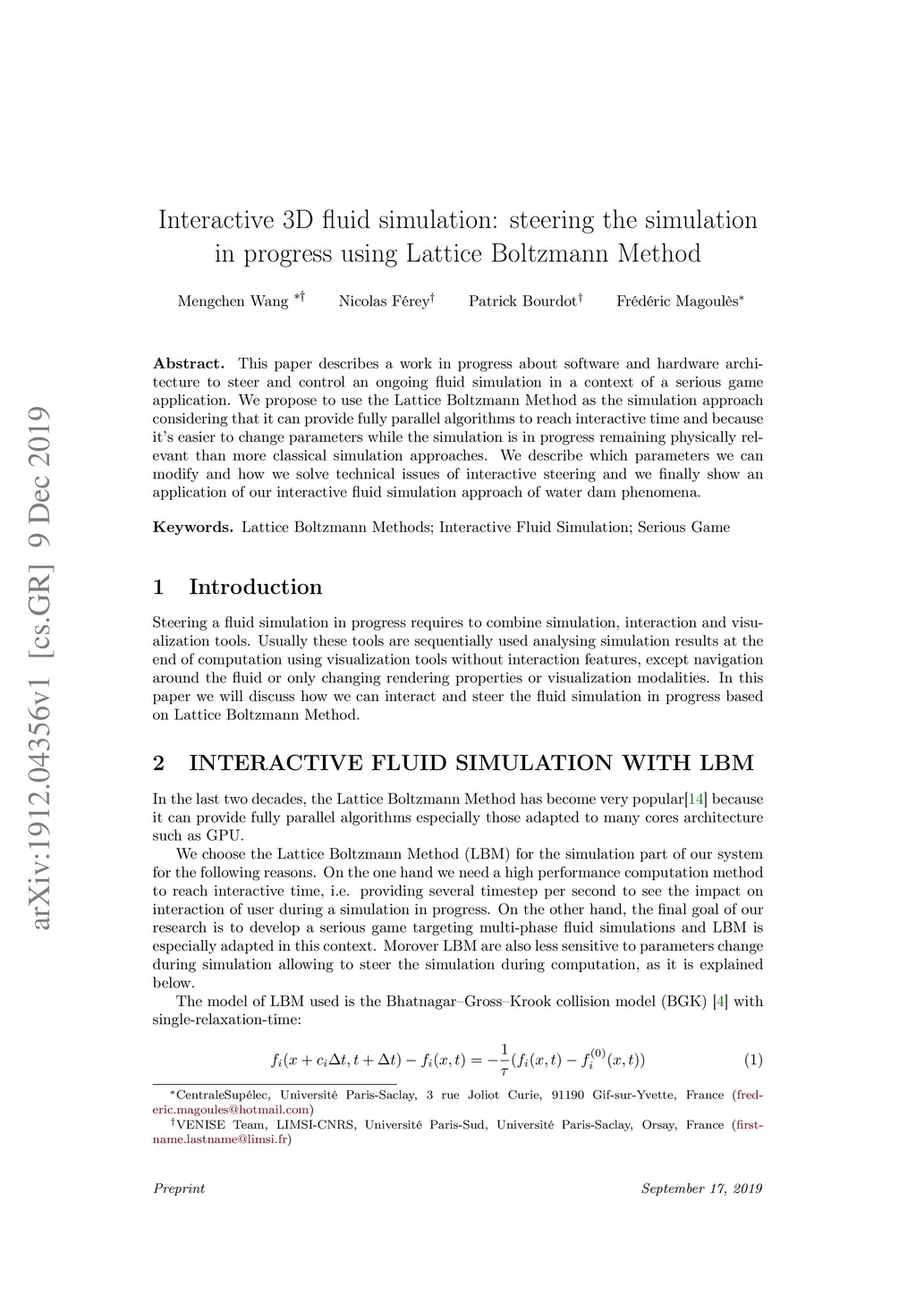 This paper describes a work in progress about software and hardware architecture to steer and control an ongoing fluid simulation in a context of a serious game application. We propose to use the Lattice Boltzmann Method as the simulation approach considering that it can provide fully parallel algorithms to reach interactive time and because it is easier to change parameters while the simulation is in progress remaining physically relevant than more classical simulation approaches. We describe which parameters we can modify and how we solve technical issues of interactive steering and we finally show an application of our interactive fluid simulation approach of water dam phenomena.