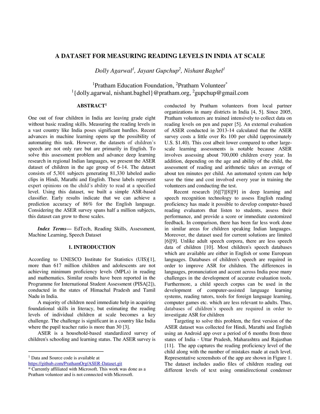 One out of four children in India are leaving grade eight without basic reading skills. Measuring the reading levels in a vast country like India poses significant hurdles. Recent advances in machine learning opens up the possibility of automating this task. However, the datasets of children's speech are not only rare but are primarily in English. To solve this assessment problem and advance deep learning research in regional Indian languages, we present the ASER dataset of children in the age group of 6-14. The dataset consists of 5,301 subjects generating 81,330 labeled audio clips in Hindi, Marathi and English. These labels represent expert opinions on the child's ability to read at a specified level. Using this dataset, we built a simple ASR-based classifier. Early results indicate that we can achieve a prediction accuracy of 86% for the English language. Considering the ASER survey spans half a million subjects, this dataset can grow to those scales.