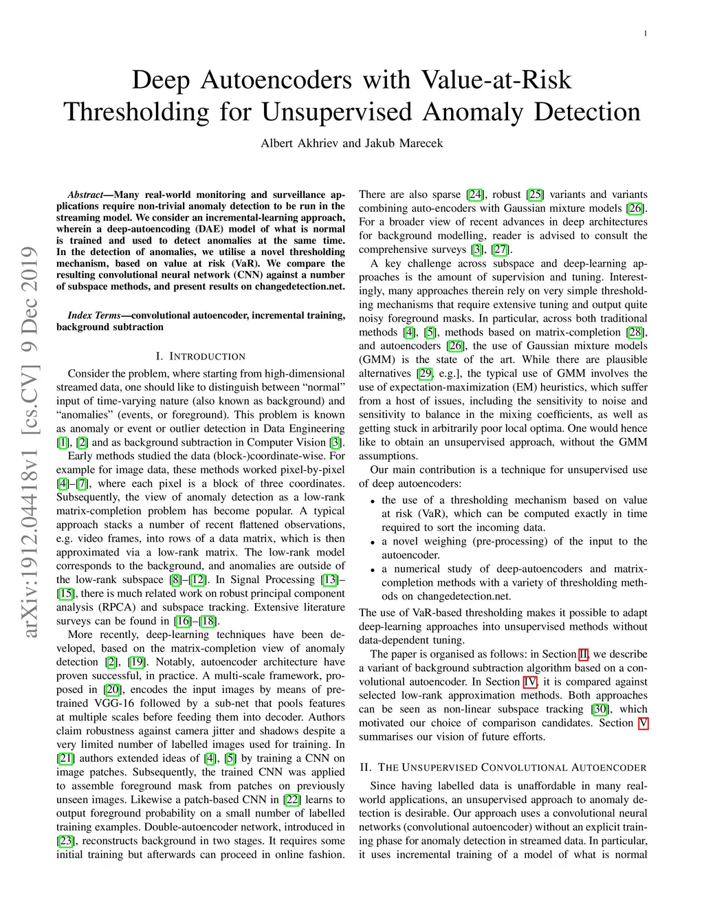 Many real-world monitoring and surveillance applications require non-trivial anomaly detection to be run in the streaming model. We consider an incremental-learning approach, wherein a deep-autoencoding (DAE) model of what is normal is trained and used to detect anomalies at the same time. In the detection of anomalies, we utilise a novel thresholding mechanism, based on value at risk (VaR). We compare the resulting convolutional neural network (CNN) against a number of subspace methods, and present results on changedetection net.
