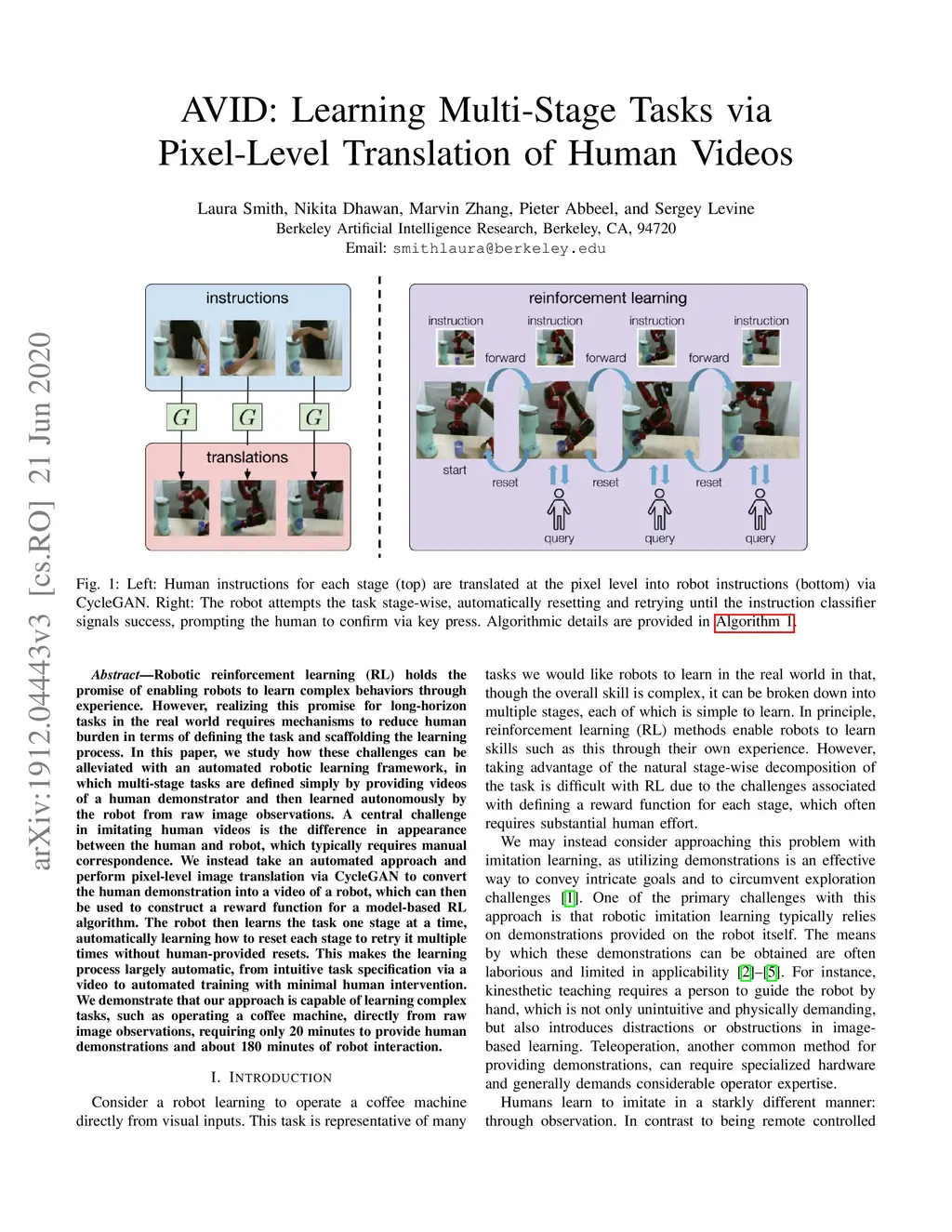 AVID: Learning Multi-Stage Tasks via Pixel-Level Translation of Human