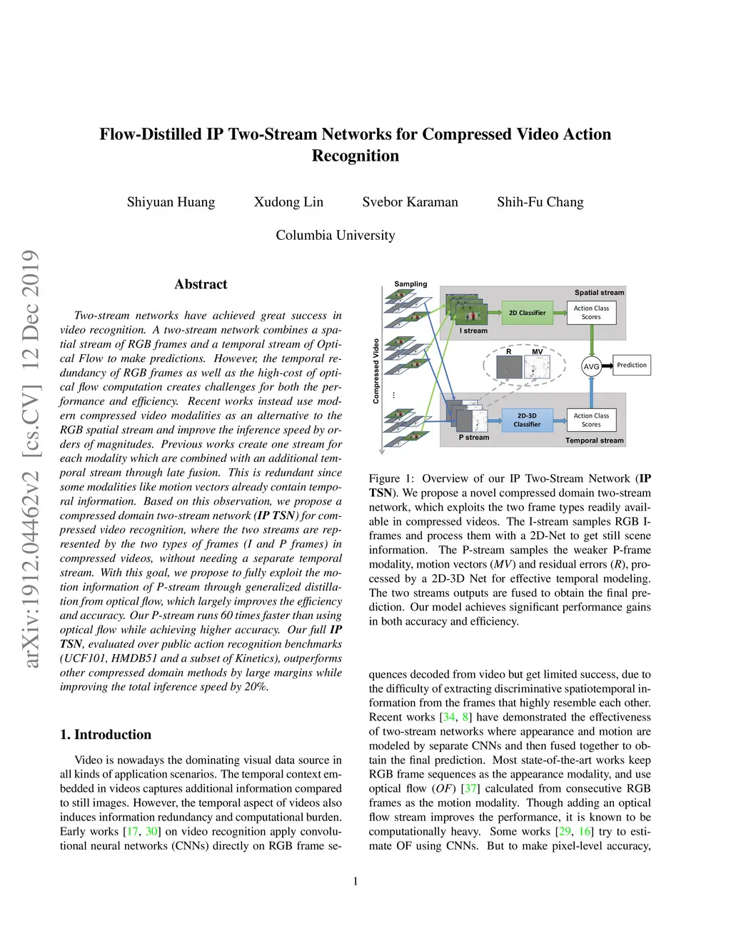 Two-stream networks have achieved great success in video recognition. A two-stream network combines a spatial stream of RGB frames and a temporal stream of Optical Flow to make predictions. However, the temporal redundancy of RGB frames as well as the high-cost of optical flow computation creates challenges for both the performance and efficiency. Recent works instead use modern compressed video modalities as an alternative to the RGB spatial stream and improve the inference speed by orders of magnitudes. Previous works create one stream for each modality which are combined with an additional temporal stream through late fusion. This is redundant since some modalities like motion vectors already contain temporal information. Based on this observation, we propose a compressed domain two-stream network IP TSN for compressed video recognition, where the two streams are represented by the two types of frames (I and P frames) in compressed videos, without needing a separate temporal stream. With this goal, we propose to fully exploit the motion information of P-stream through generalized distillation from optical flow, which largely improves the efficiency and accuracy. Our P-stream runs 60 times faster than using optical flow while achieving higher accuracy. Our full IP TSN, evaluated over public action recognition benchmarks (UCF101, HMDB51 and a subset of Kinetics), outperforms other compressed domain methods by large margins while improving the total inference speed by 20%.