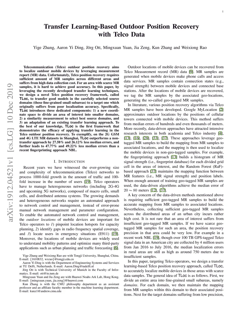 Transfer Learning-Based Outdoor Position Recovery with Telco Data