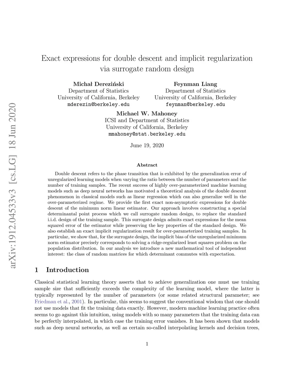 Double descent refers to the phase transition that is exhibited by the generalization error of unregularized learning models when varying the ratio between the number of parameters and the number of training samples. The recent success of highly over-parameterized machine learning models such as deep neural networks has motivated a theoretical analysis of the double descent phenomenon in classical models such as linear regression which can also generalize well in the over-parameterized regime. We build on recent advances in Randomized Numerical Linear Algebra (RandNLA) to provide the first exact non-asymptotic expressions for double descent of the minimum norm linear estimator. Our approach involves constructing what we call a surrogate random design to replace the standard i.i.d. design of the training sample. This surrogate design admits exact expressions for the mean squared error of the estimator while preserving the key properties of the standard design. We also establish an exact implicit regularization result for over-parameterized training samples. In particular, we show that, for the surrogate design, the implicit bias of the unregularized minimum norm estimator precisely corresponds to solving a ridge-regularized least squares problem on the population distribution.