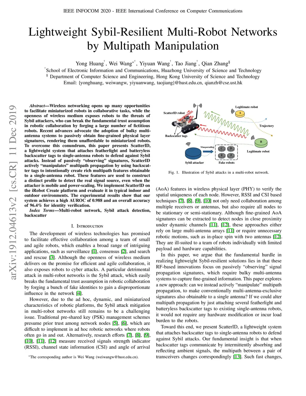 Wireless networking opens up many opportunities to facilitate miniaturized robots in collaborative tasks, while the openness of wireless medium exposes robots to the threats of Sybil attackers, who can break the fundamental trust assumption in robotic collaboration by forging a large number of fictitious robots. Recent advances advocate the adoption of bulky multi-antenna systems to passively obtain fine-grained physical layer signatures, rendering them unaffordable to miniaturized robots. To overcome this conundrum, this paper presents ScatterID, a lightweight system that attaches featherlight and batteryless backscatter tags to single-antenna robots to defend against Sybil attacks. Instead of passively "observing" signatures, ScatterID actively "manipulates" multipath propagation by using backscatter tags to intentionally create rich multipath features obtainable to a single-antenna robot. These features are used to construct a distinct profile to detect the real signal source, even when the attacker is mobile and power-scaling. We implement ScatterID on the iRobot Create platform and evaluate it in typical indoor and outdoor environments. The experimental results show that our system achieves a high AUROC of 0.988 and an overall accuracy of 96.4% for identity verification.