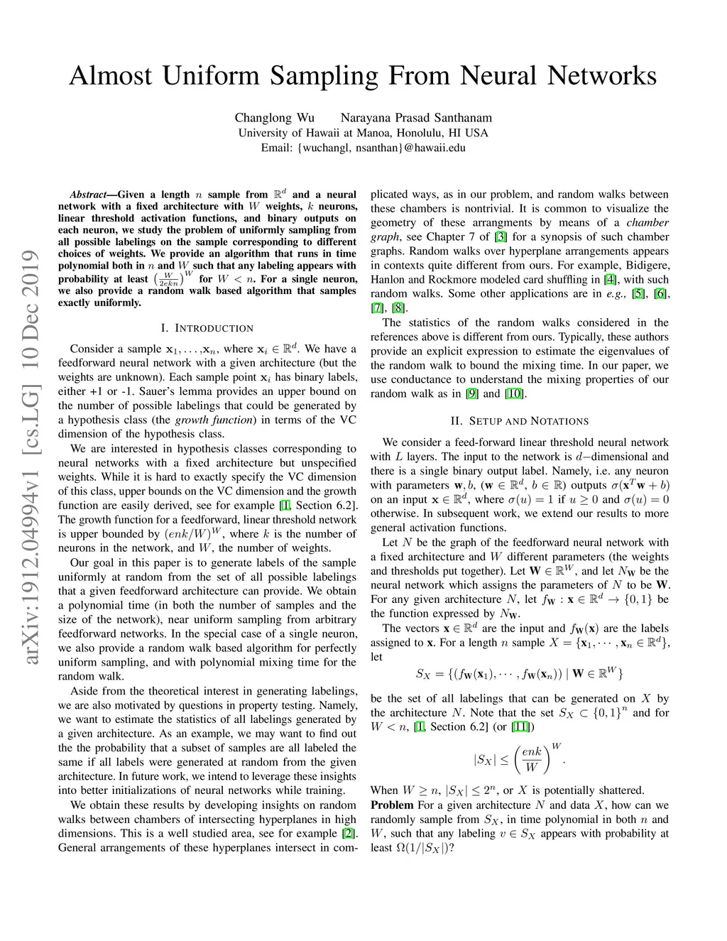 Given a length sample from and a neural network with a fixed architecture with weights, neurons, linear threshold activation functions, and binary outputs on each neuron, we study the problem of uniformly sampling from all possible labelings on the sample corresponding to different choices of weights. We provide an algorithm that runs in time polynomial both in and such that any labeling appears with probability at least for . For a single neuron, we also provide a random walk based algorithm that samples exactly uniformly.