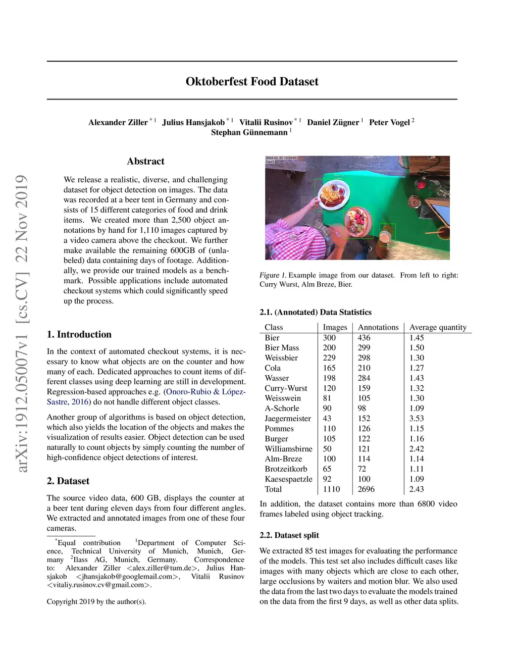 We release a realistic, diverse, and challenging dataset for object detection on images. The data was recorded at a beer tent in Germany and consists of 15 different categories of food and drink items. We created more than 2,500 object annotations by hand for 1,110 images captured by a video camera above the checkout. We further make available the remaining 600GB of (unlabeled) data containing days of footage. Additionally, we provide our trained models as a benchmark. Possible applications include automated checkout systems which could significantly speed up the process.