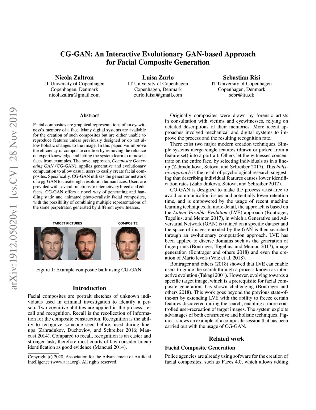 Facial composites are graphical representations of an eyewitness's memory of a face. Many digital systems are available for the creation of such composites but are either unable to reproduce features unless previously designed or do not allow holistic changes to the image. In this paper, we improve the efficiency of composite creation by removing the reliance on expert knowledge and letting the system learn to represent faces from examples. The novel approach, Composite Generating GAN (CG-GAN), applies generative and evolutionary computation to allow casual users to easily create facial composites. Specifically, CG-GAN utilizes the generator network of a pg-GAN to create high-resolution human faces. Users are provided with several functions to interactively breed and edit faces. CG-GAN offers a novel way of generating and handling static and animated photo-realistic facial composites, with the possibility of combining multiple representations of the same perpetrator, generated by different eyewitnesses.