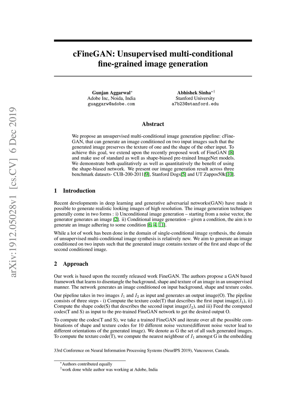 We propose an unsupervised multi-conditional image generation pipeline: cFineGAN, that can generate an image conditioned on two input images such that the generated image preserves the texture of one and the shape of the other input. To achieve this goal, we extend upon the recently proposed work of FineGAN \citep{singh2018finegan} and make use of standard as well as shape-biased pre-trained ImageNet models. We demonstrate both qualitatively as well as quantitatively the benefit of using the shape-biased network. We present our image generation result across three benchmark datasets- CUB-200-2011, Stanford Dogs and UT Zappos50k.