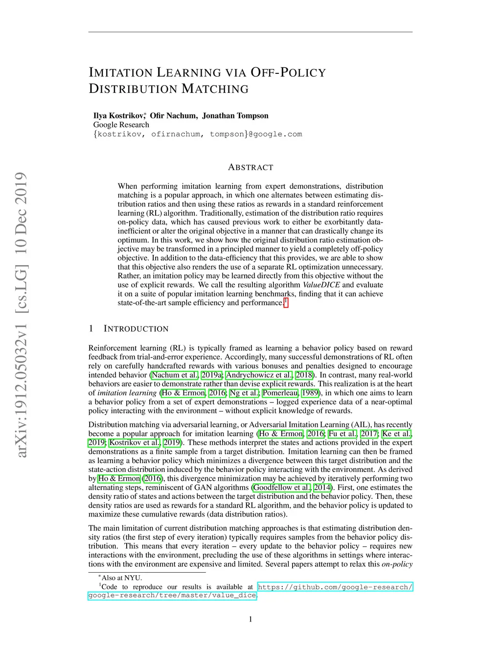 When performing imitation learning from expert demonstrations, distribution matching is a popular approach, in which one alternates between estimating distribution ratios and then using these ratios as rewards in a standard reinforcement learning (RL) algorithm. Traditionally, estimation of the distribution ratio requires on-policy data, which has caused previous work to either be exorbitantly data-inefficient or alter the original objective in a manner that can drastically change its optimum. In this work, we show how the original distribution ratio estimation objective may be transformed in a principled manner to yield a completely off-policy objective. In addition to the data-efficiency that this provides, we are able to show that this objective also renders the use of a separate RL optimization unnecessary.Rather, an imitation policy may be learned directly from this objective without the use of explicit rewards. We call the resulting algorithm ValueDICE and evaluate it on a suite of popular imitation learning benchmarks, finding that it can achieve state-of-the-art sample efficiency and performance.