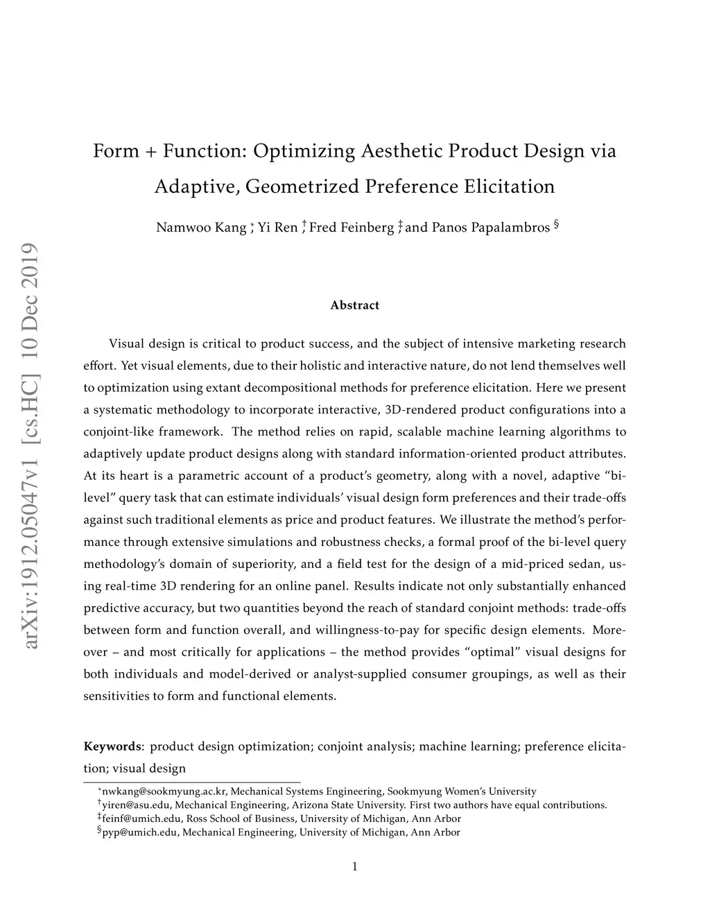 Visual design is critical to product success, and the subject of intensive marketing research effort. Yet visual elements, due to their holistic and interactive nature, do not lend themselves well to optimization using extant decompositional methods for preference elicitation. Here we present a systematic methodology to incorporate interactive, 3D-rendered product configurations into a conjoint-like framework. The method relies on rapid, scalable machine learning algorithms to adaptively update product designs along with standard information-oriented product attributes. At its heart is a parametric account of a product's geometry, along with a novel, adaptive "bi-level" query task that can estimate individuals' visual design form preferences and their trade-offs against such traditional elements as price and product features. We illustrate the method's performance through extensive simulations and robustness checks, a formal proof of the bi-level query methodology's domain of superiority, and a field test for the design of a mid-priced sedan, using real-time 3D rendering for an online panel. Results indicate not only substantially enhanced predictive accuracy, but two quantities beyond the reach of standard conjoint methods: trade-offs between form and function overall, and willingness-to-pay for specific design elements. Moreover -- and most critically for applications -- the method provides "optimal" visual designs for both individuals and model-derived or analyst-supplied consumer groupings, as well as their sensitivities to form and functional elements.