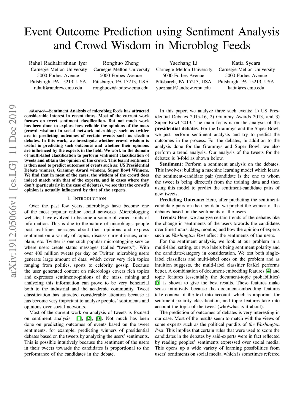 Sentiment Analysis of microblog feeds has attracted considerable interest in recent times. Most of the current work focuses on tweet sentiment classification. But not much work has been done to explore how reliable the opinions of the mass (crowd wisdom) in social network microblogs such as twitter are in predicting outcomes of certain events such as election debates. In this work, we investigate whether crowd wisdom is useful in predicting such outcomes and whether their opinions are influenced by the experts in the field. We work in the domain of multi-label classification to perform sentiment classification of tweets and obtain the opinion of the crowd. This learnt sentiment is then used to predict outcomes of events such as: US Presidential Debate winners, Grammy Award winners, Super Bowl Winners. We find that in most of the cases, the wisdom of the crowd does indeed match with that of the experts, and in cases where they don't (particularly in the case of debates), we see that the crowd's opinion is actually influenced by that of the experts.
