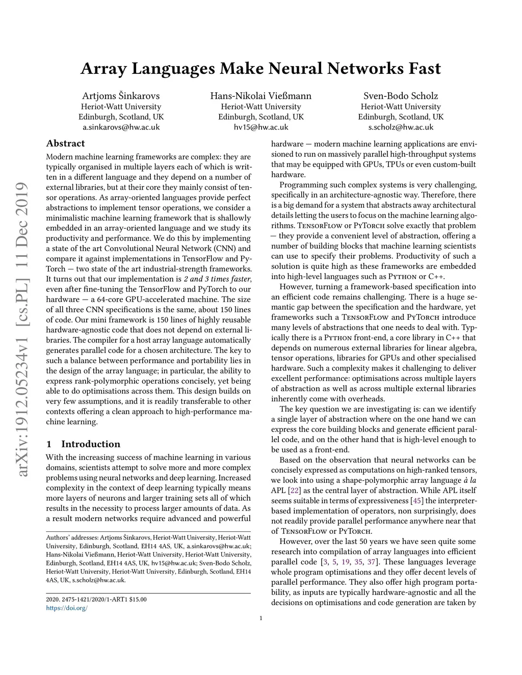 Modern machine learning frameworks are complex: they are typically organised in multiple layers each of which is written in a different language and they depend on a number of external libraries, but at their core they mainly consist of tensor operations. As array-oriented languages provide perfect abstractions to implement tensor operations, we consider a minimalistic machine learning framework that is shallowly embedded in an array-oriented language and we study its productivity and performance. We do this by implementing a state of the art Convolutional Neural Network (CNN) and compare it against implementations in TensorFlow and PyTorch --- two state of the art industrial-strength frameworks. It turns out that our implementation is 2 and 3 times faster, even after fine-tuning the TensorFlow and PyTorch to our hardware --- a 64-core GPU-accelerated machine. The size of all three CNN specifications is the same, about 150 lines of code. Our mini framework is 150 lines of highly reusable hardware-agnostic code that does not depend on external libraries. The compiler for a host array language automatically generates parallel code for a chosen architecture. The key to such a balance between performance and portability lies in the design of the array language; in particular, the ability to express rank-polymorphic operations concisely, yet being able to do optimisations across them. This design builds on very few assumptions, and it is readily transferable to other contexts offering a clean approach to high-performance machine learning.