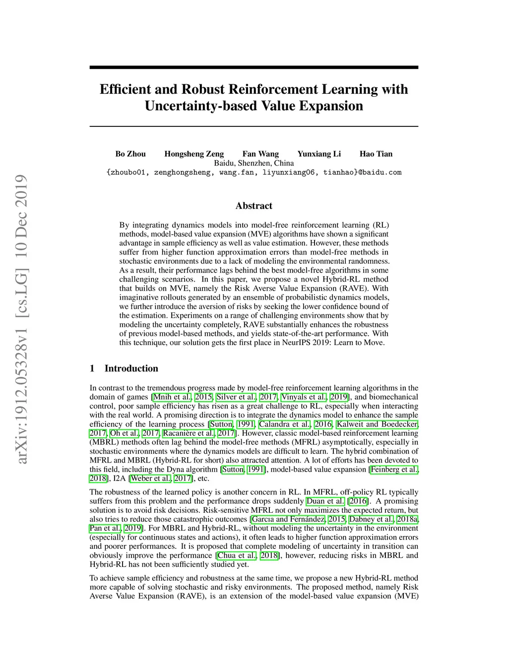 By integrating dynamics models into model-free reinforcement learning (RL) methods, model-based value expansion (MVE) algorithms have shown a significant advantage in sample efficiency as well as value estimation. However, these methods suffer from higher function approximation errors than model-free methods in stochastic environments due to a lack of modeling the environmental randomness. As a result, their performance lags behind the best model-free algorithms in some challenging scenarios. In this paper, we propose a novel Hybrid-RL method that builds on MVE, namely the Risk Averse Value Expansion (RAVE). With imaginative rollouts generated by an ensemble of probabilistic dynamics models, we further introduce the aversion of risks by seeking the lower confidence bound of the estimation. Experiments on a range of challenging environments show that by modeling the uncertainty completely, RAVE substantially enhances the robustness of previous model-based methods, and yields state-of-the-art performance. With this technique, our solution gets the first place in NeurIPS 2019: Learn to Move.