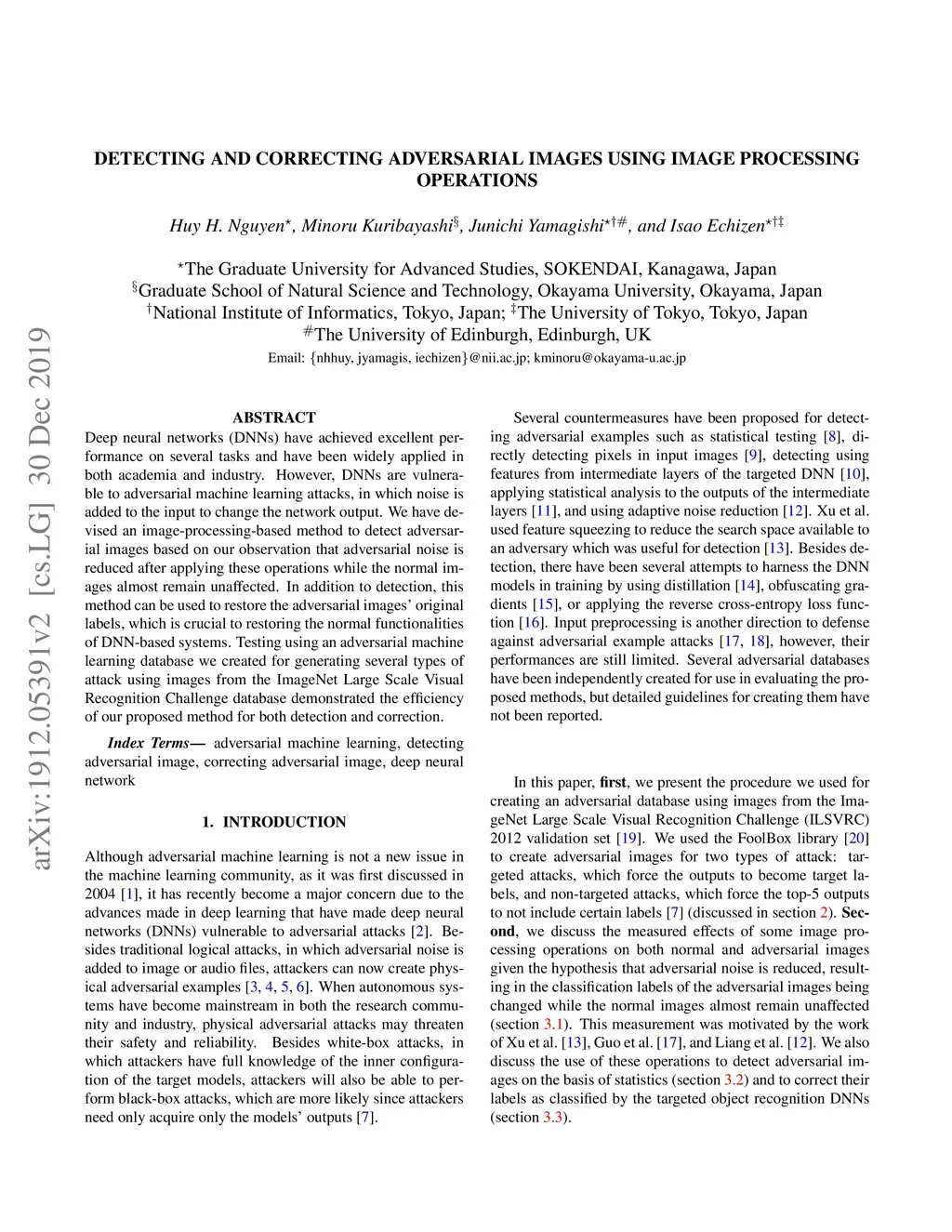Deep neural networks (DNNs) have achieved excellent performance on several tasks and have been widely applied in both academia and industry. However, DNNs are vulnerable to adversarial machine learning attacks, in which noise is added to the input to change the network output. We have devised an image-processing-based method to detect adversarial images based on our observation that adversarial noise is reduced after applying these operations while the normal images almost remain unaffected. In addition to detection, this method can be used to restore the adversarial images' original labels, which is crucial to restoring the normal functionalities of DNN-based systems. Testing using an adversarial machine learning database we created for generating several types of attack using images from the ImageNet Large Scale Visual Recognition Challenge database demonstrated the efficiency of our proposed method for both detection and correction.