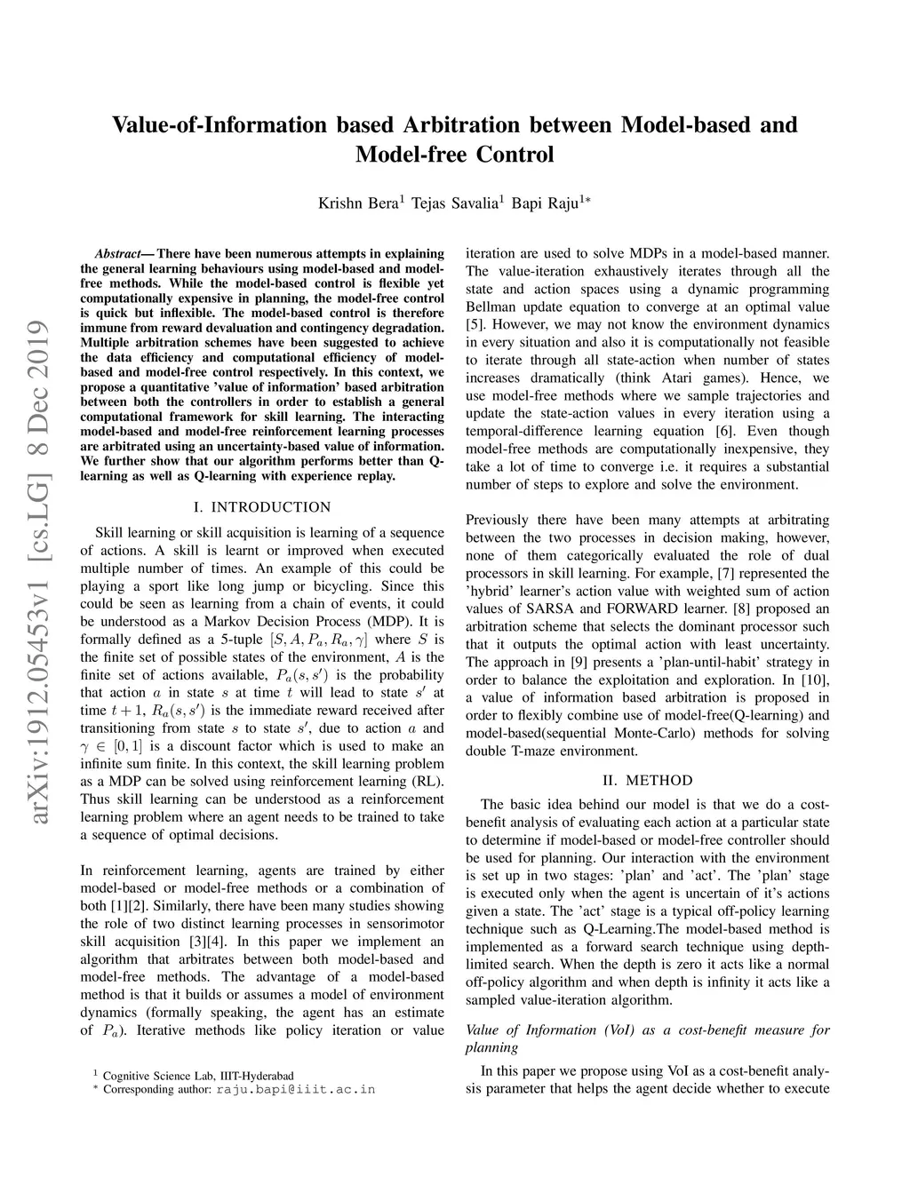 There have been numerous attempts in explaining the general learning behaviours using model-based and model-free methods. While the model-based control is flexible yet computationally expensive in planning, the model-free control is quick but inflexible. The model-based control is therefore immune from reward devaluation and contingency degradation. Multiple arbitration schemes have been suggested to achieve the data efficiency and computational efficiency of model-based and model-free control respectively. In this context, we propose a quantitative 'value of information' based arbitration between both the controllers in order to establish a general computational framework for skill learning. The interacting model-based and model-free reinforcement learning processes are arbitrated using an uncertainty-based value of information. We further show that our algorithm performs better than Q-learning as well as Q-learning with experience replay.