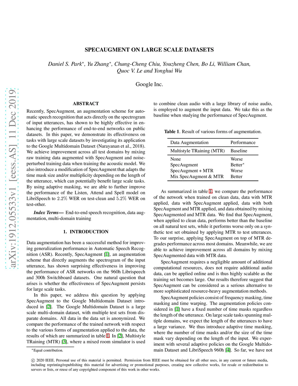 Recently, SpecAugment, an augmentation scheme for automatic speech recognition that acts directly on the spectrogram of input utterances, has shown to be highly effective in enhancing the performance of end-to-end networks on public datasets. In this paper, we demonstrate its effectiveness on tasks with large scale datasets by investigating its application to the Google Multidomain Dataset (Narayanan et al., 2018). We achieve improvement across all test domains by mixing raw training data augmented with SpecAugment and noise-perturbed training data when training the acoustic model. We also introduce a modification of SpecAugment that adapts the time mask size and/or multiplicity depending on the length of the utterance, which can potentially benefit large scale tasks. By using adaptive masking, we are able to further improve the performance of the Listen, Attend and Spell model on LibriSpeech to 2.2% WER on test-clean and 5.2% WER on test-other.