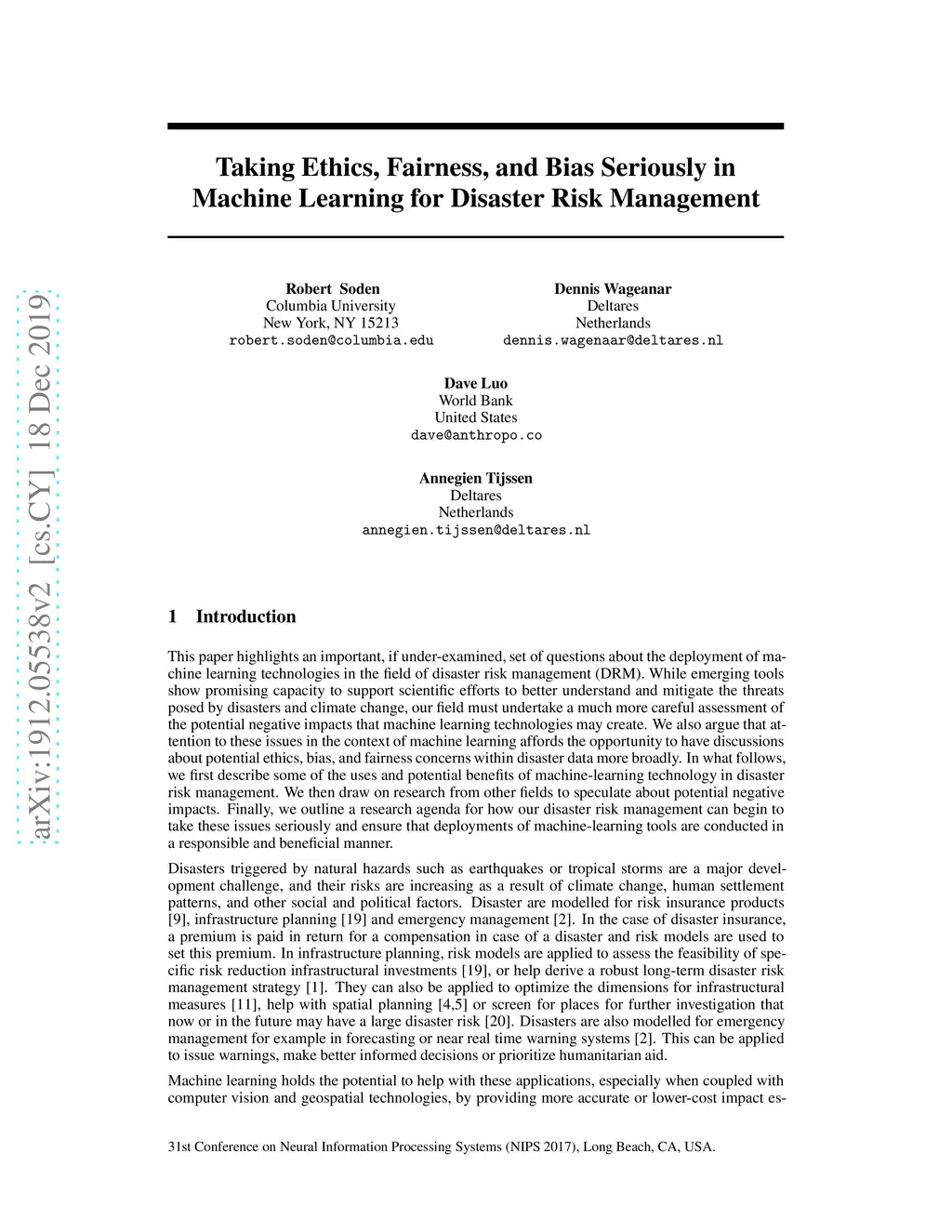 This paper highlights an important, if under-examined, set of questions about the deployment of machine learning technologies in the field of disaster risk management (DRM). While emerging tools show promising capacity to support scientific efforts to better understand and mitigate the threats posed by disasters and climate change, our field must undertake a much more careful assessment of the potential negative impacts that machine learning technologies may create. We also argue that attention to these issues in the context of machine learning affords the opportunity to have discussions about potential ethics, bias, and fairness concerns within disaster data more broadly. In what follows, we first describe some of the uses and potential benefits of machine-learning technology in disaster risk management. We then draw on research from other fields to speculate about potential negative impacts. Finally, we outline a research agenda for how our disaster risk management can begin to take these issues seriously and ensure that deployments of machine-learning tools are conducted in a responsible and beneficial manner.