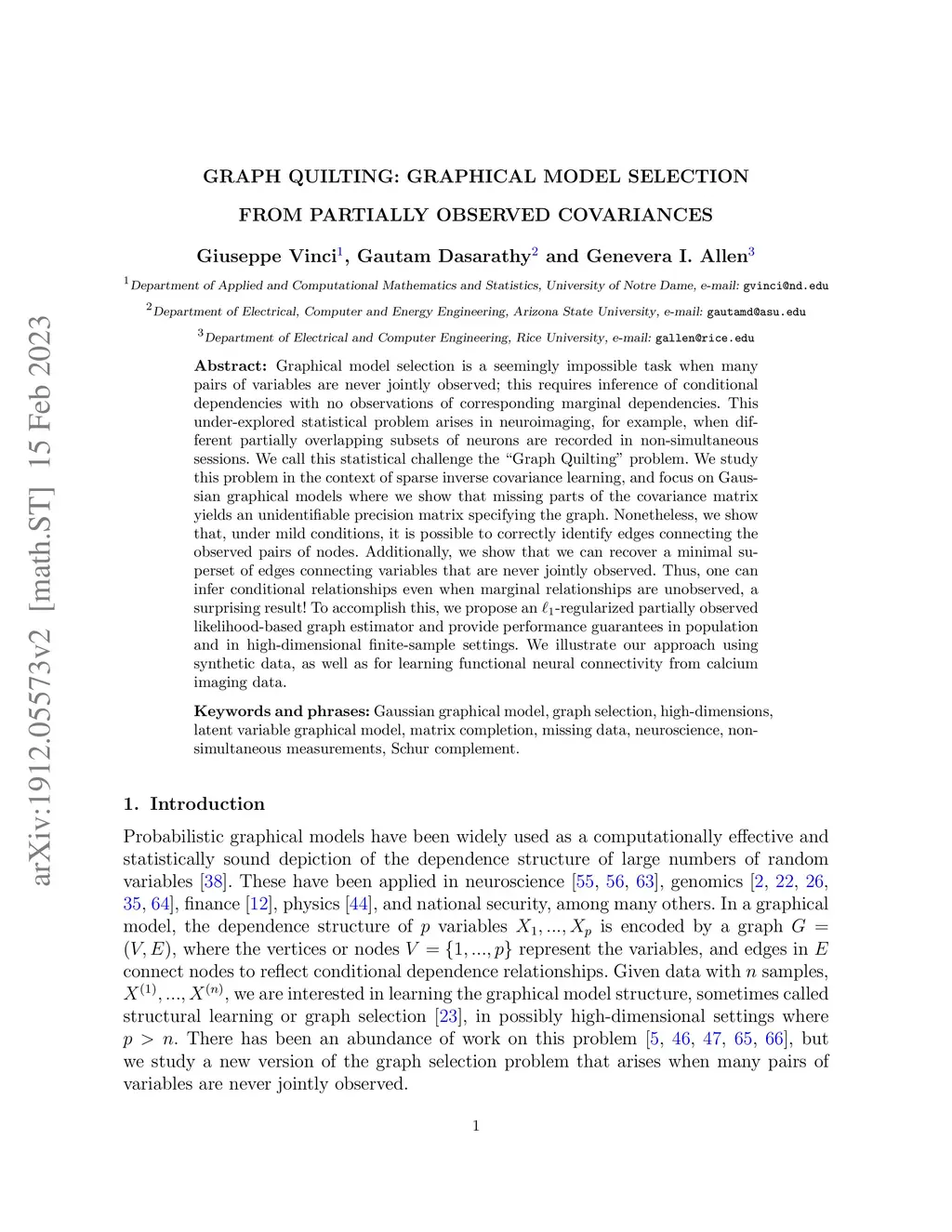 Graphical model selection is a seemingly impossible task when many pairs of variables are never jointly observed; this requires inference of conditional dependencies with no observations of corresponding marginal dependencies. This under-explored statistical problem arises in neuroimaging, for example, when different partially overlapping subsets of neurons are recorded in non-simultaneous sessions. We call this statistical challenge the "Graph Quilting" problem. We study this problem in the context of sparse inverse covariance learning, and focus on Gaussian graphical models where we show that missing parts of the covariance matrix yields an unidentifiable precision matrix specifying the graph. Nonetheless, we show that, under mild conditions, it is possible to correctly identify edges connecting the observed pairs of nodes. Additionally, we show that we can recover a minimal superset of edges connecting variables that are never jointly observed. Thus, one can infer conditional relationships even when marginal relationships are unobserved, a surprising result! To accomplish this, we propose an -regularized partially observed likelihood-based graph estimator and provide performance guarantees in population and in high-dimensional finite-sample settings. We illustrate our approach using synthetic data, as well as for learning functional neural connectivity from calcium imaging data.