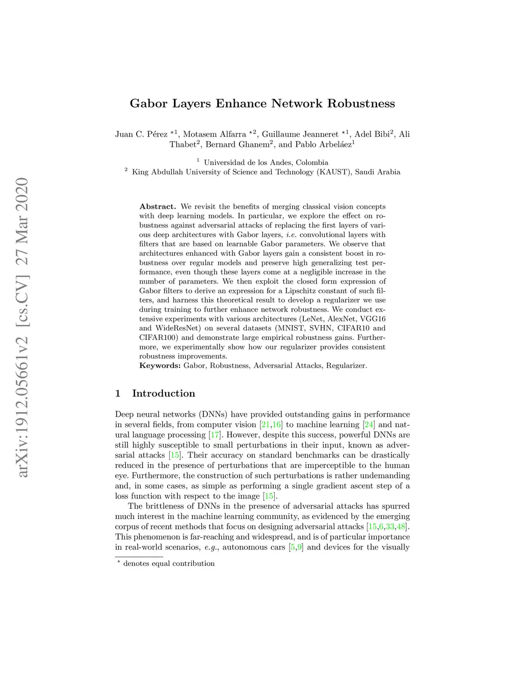 We revisit the benefits of merging classical vision concepts with deep learning models. In particular, we explore the effect on robustness against adversarial attacks of replacing the first layers of various deep architectures with Gabor layers, i.e. convolutional layers with filters that are based on learnable Gabor parameters. We observe that architectures enhanced with Gabor layers gain a consistent boost in robustness over regular models and preserve high generalizing test performance, even though these layers come at a negligible increase in the number of parameters. We then exploit the closed form expression of Gabor filters to derive an expression for a Lipschitz constant of such filters, and harness this theoretical result to develop a regularizer we use during training to further enhance network robustness. We conduct extensive experiments with various architectures (LeNet, AlexNet, VGG16 and WideResNet) on several datasets (MNIST, SVHN, CIFAR10 and CIFAR100) and demonstrate large empirical robustness gains. Furthermore, we experimentally show how our regularizer provides consistent robustness improvements.