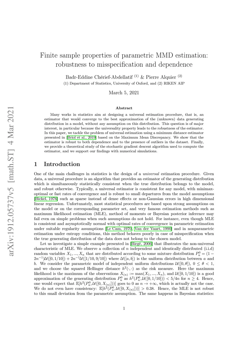 Many works in statistics aim at designing a universal estimation procedure, that is, an estimator that would converge to the best approximation of the (unknown) data generating distribution in a model, without any assumption on this distribution. This question is of major interest, in particular because the universality property leads to the robustness of the estimator. In this paper, we tackle the problem of universal estimation using a minimum distance estimator presented in Briol et al. (2019) based on the Maximum Mean Discrepancy. We show that the estimator is robust to both dependence and to the presence of outliers in the dataset. Finally, we provide a theoretical study of the stochastic gradient descent algorithm used to compute the estimator, and we support our findings with numerical simulations.