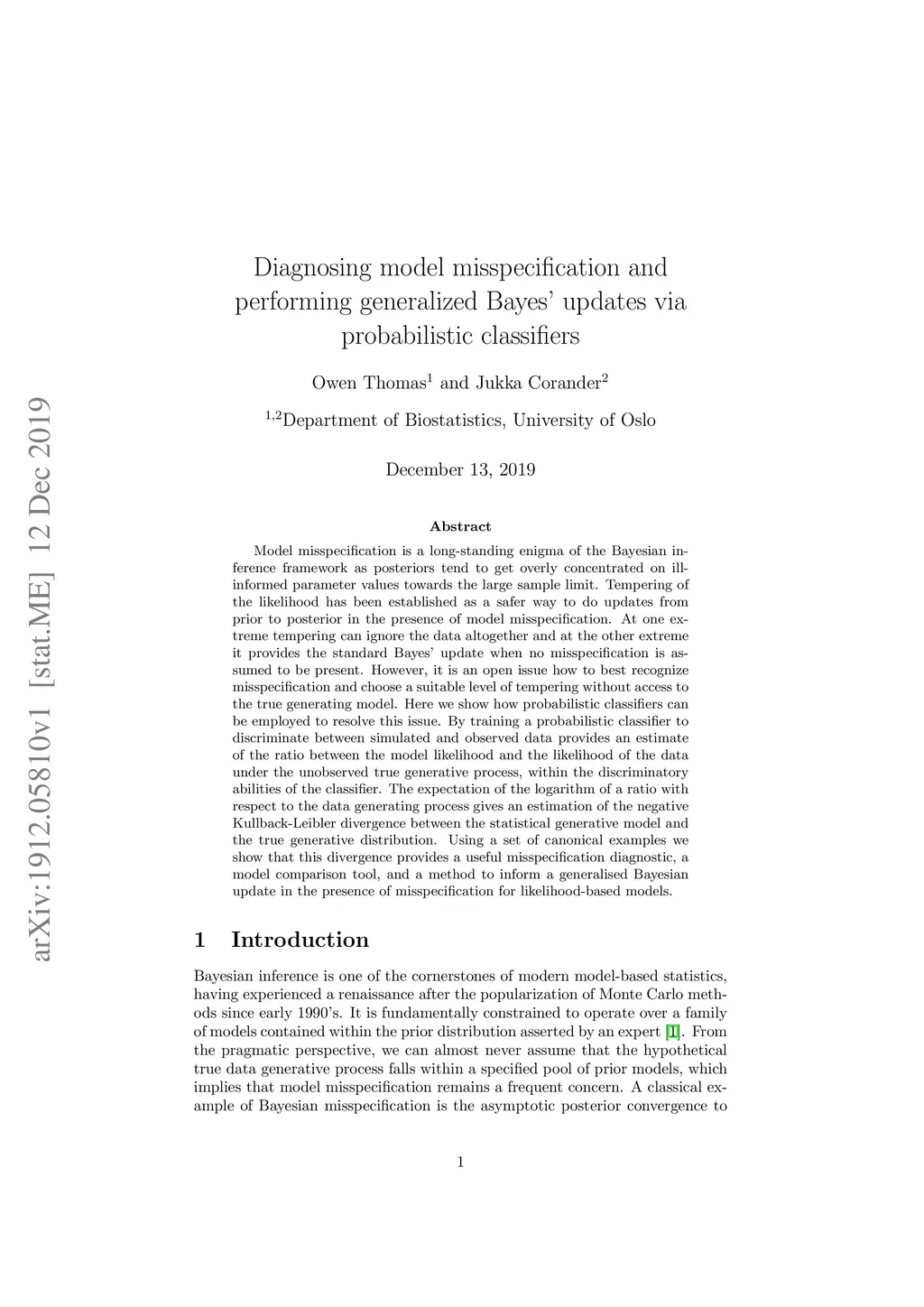 Model misspecification is a long-standing enigma of the Bayesian inference framework as posteriors tend to get overly concentrated on ill-informed parameter values towards the large sample limit. Tempering of the likelihood has been established as a safer way to do updates from prior to posterior in the presence of model misspecification. At one extreme tempering can ignore the data altogether and at the other extreme it provides the standard Bayes' update when no misspecification is assumed to be present. However, it is an open issue how to best recognize misspecification and choose a suitable level of tempering without access to the true generating model. Here we show how probabilistic classifiers can be employed to resolve this issue. By training a probabilistic classifier to discriminate between simulated and observed data provides an estimate of the ratio between the model likelihood and the likelihood of the data under the unobserved true generative process, within the discriminatory abilities of the classifier. The expectation of the logarithm of a ratio with respect to the data generating process gives an estimation of the negative Kullback-Leibler divergence between the statistical generative model and the true generative distribution. Using a set of canonical examples we show that this divergence provides a useful misspecification diagnostic, a model comparison tool, and a method to inform a generalised Bayesian update in the presence of misspecification for likelihood-based models.