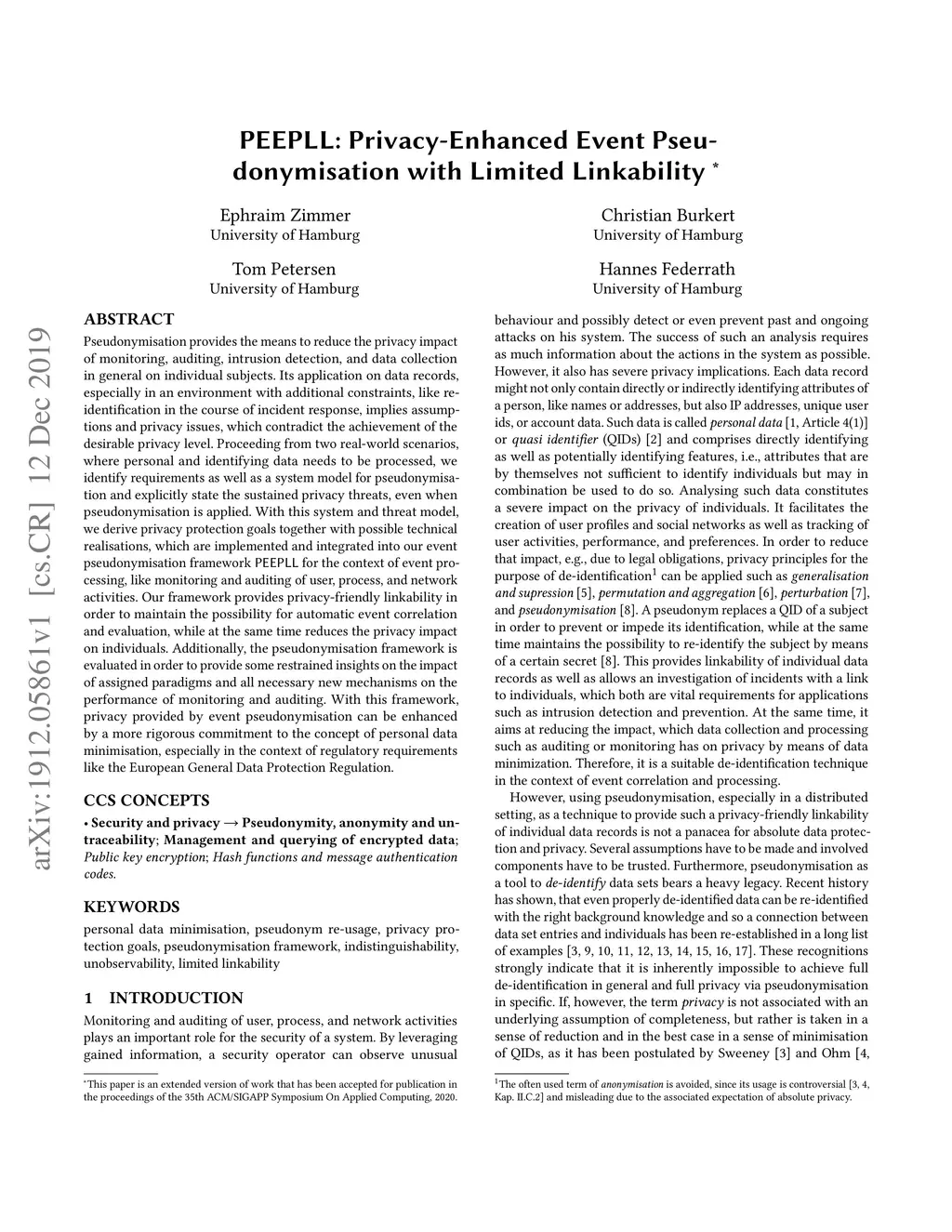 PEEPLL: Privacy-Enhanced Event Pseudonymisation with Limited Linkability