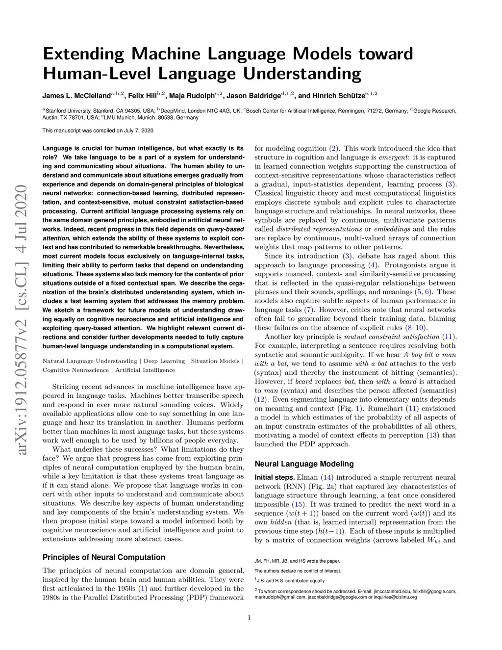 Language is crucial for human intelligence, but what exactly is its role? We take language to be a part of a system for understanding and communicating about situations. The human ability to understand and communicate about situations emerges gradually from experience and depends on domain-general principles of biological neural networks: connection-based learning, distributed representation, and context-sensitive, mutual constraint satisfaction-based processing. Current artificial language processing systems rely on the same domain general principles, embodied in artificial neural networks. Indeed, recent progress in this field depends on \emph{query-based attention}, which extends the ability of these systems to exploit context and has contributed to remarkable breakthroughs. Nevertheless, most current models focus exclusively on language-internal tasks, limiting their ability to perform tasks that depend on understanding situations. These systems also lack memory for the contents of prior situations outside of a fixed contextual span. We describe the organization of the brain's distributed understanding system, which includes a fast learning system that addresses the memory problem. We sketch a framework for future models of understanding drawing equally on cognitive neuroscience and artificial intelligence and exploiting query-based attention. We highlight relevant current directions and consider further developments needed to fully capture human-level language understanding in a computational system.