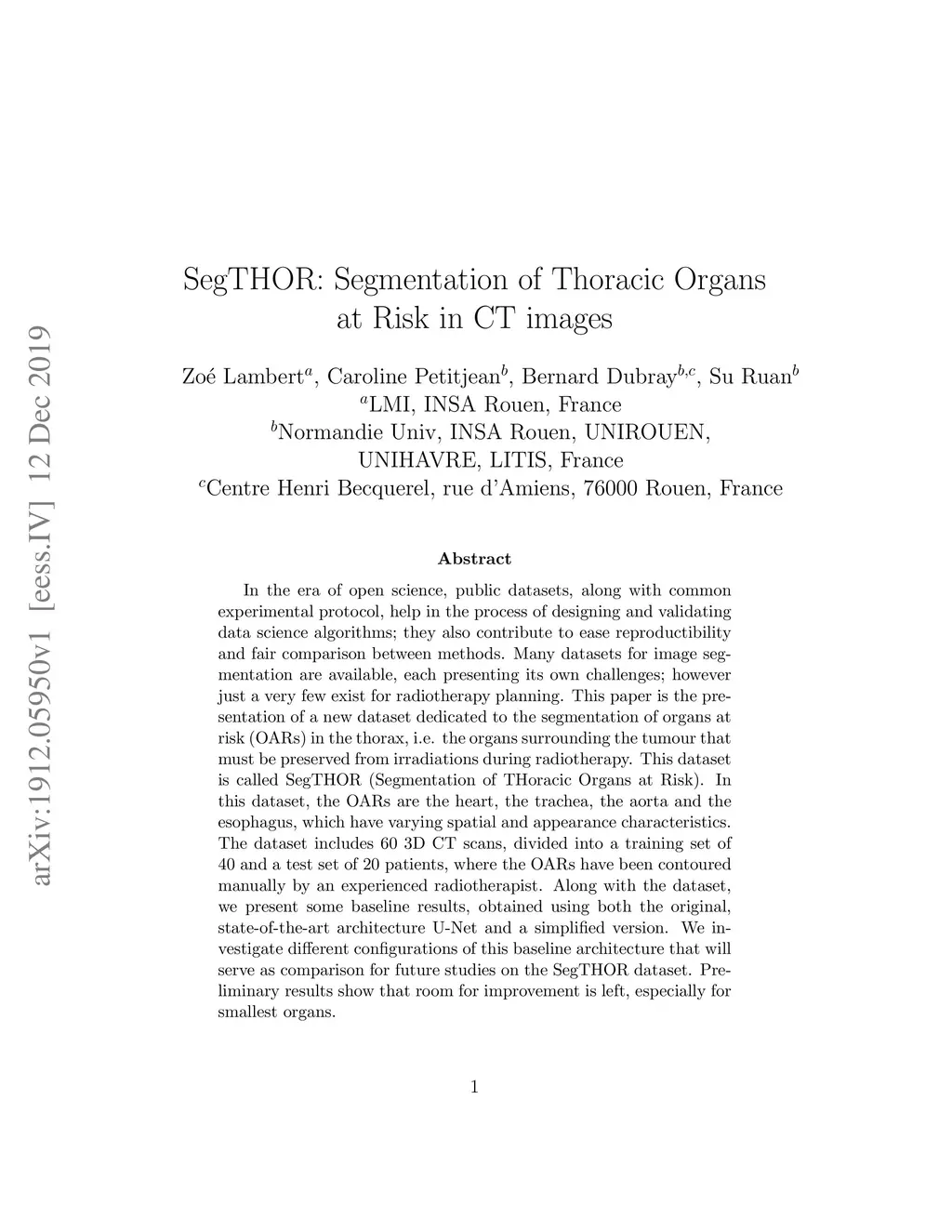 In the era of open science, public datasets, along with common experimental protocol, help in the process of designing and validating data science algorithms; they also contribute to ease reproductibility and fair comparison between methods. Many datasets for image segmentation are available, each presenting its own challenges; however just a very few exist for radiotherapy planning. This paper is the presentation of a new dataset dedicated to the segmentation of organs at risk (OARs) in the thorax, i.e. the organs surrounding the tumour that must be preserved from irradiations during radiotherapy. This dataset is called SegTHOR (Segmentation of THoracic Organs at Risk). In this dataset, the OARs are the heart, the trachea, the aorta and the esophagus, which have varying spatial and appearance characteristics. The dataset includes 60 3D CT scans, divided into a training set of 40 and a test set of 20 patients, where the OARs have been contoured manually by an experienced radiotherapist. Along with the dataset, we present some baseline results, obtained using both the original, state-of-the-art architecture U-Net and a simplified version. We investigate different configurations of this baseline architecture that will serve as comparison for future studies on the SegTHOR dataset. Preliminary results show that room for improvement is left, especially for smallest organs.