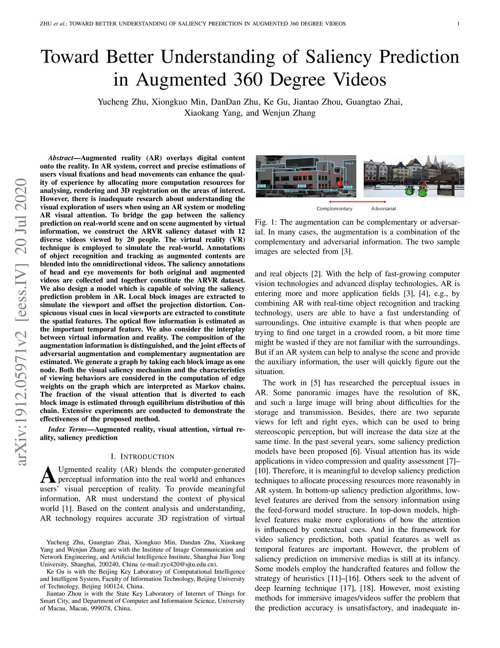 Augmented reality (AR) overlays digital content onto the reality. In AR system, correct and precise estimations of user's visual fixations and head movements can enhance the quality of experience by allocating more computation resources on the areas of interest. However, there is inadequate research about understanding the visual exploration of users when using an AR system or modeling AR visual attention. To bridge the gap between the saliency prediction on real-world scene and on scene augmented by virtual information, we construct the ARVR saliency dataset with 12 diverse videos viewed by 20 people. The virtual reality (VR) technique is employed to simulate the real-world. Annotations of object recognition and tracking as augmented contents are blended into the omnidirectional videos. The saliency annotations of head and eye movements for both original and augmented videos are collected and together constitute the ARVR dataset. We also design a model which is capable of solving the saliency prediction problem in AR. Local block images are extracted to simulate the viewport and offset the projection distortion. Conspicuous visual cues in local viewports are extracted to constitute the spatial features. The optical flow information is estimated as the important temporal feature. We also consider the interplay between virtual information and reality. The composition of the augmentation information is distinguished, and the joint effects of adversarial augmentation and complementary augmentation are estimated. We generate a graph by taking each block image as one node. Both the visual saliency mechanism and the characteristics of viewing behaviors are considered in the computation of edge weights on the graph which are interpreted as Markov chains. The fraction of the visual attention that is diverted to each block image is estimated through equilibrium distribution on of this chain.