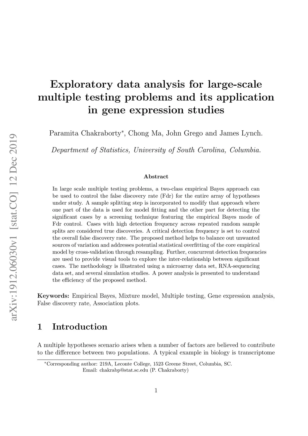 In large scale multiple testing problems, a two-class empirical Bayes approach can be used to control the false discovery rate (Fdr) for the entire array of hypotheses under study. A sample splitting step is incorporated to modify that approach where one part of the data is used for model fitting and the other part for detecting the significant cases by a screening technique featuring the empirical Bayes mode of Fdr control. Cases with high detection frequency across repeated random sample splits are considered true discoveries. A critical detection frequency is set to control the overall false discovery rate. The proposed method helps to balance out unwanted sources of variation and addresses potential statistical overfitting of the core empirical model by cross-validation through resampling. Further, concurrent detection frequencies are used to provide visual tools to explore the inter-relationship between significant cases. The methodology is illustrated using a microarray data set, RNA-sequencing data set, and several simulation studies. A power analysis is presented to understand the efficiency of the proposed method.
