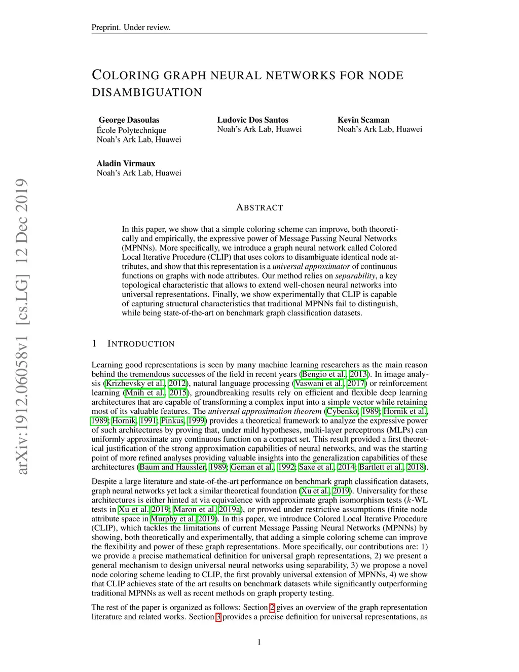 In this paper, we show that a simple coloring scheme can improve, both theoretically and empirically, the expressive power of Message Passing Neural Networks(MPNNs). More specifically, we introduce a graph neural network called Colored Local Iterative Procedure (CLIP) that uses colors to disambiguate identical node attributes, and show that this representation is a universal approximator of continuous functions on graphs with node attributes. Our method relies on separability , a key topological characteristic that allows to extend well-chosen neural networks into universal representations. Finally, we show experimentally that CLIP is capable of capturing structural characteristics that traditional MPNNs fail to distinguish,while being state-of-the-art on benchmark graph classification datasets.