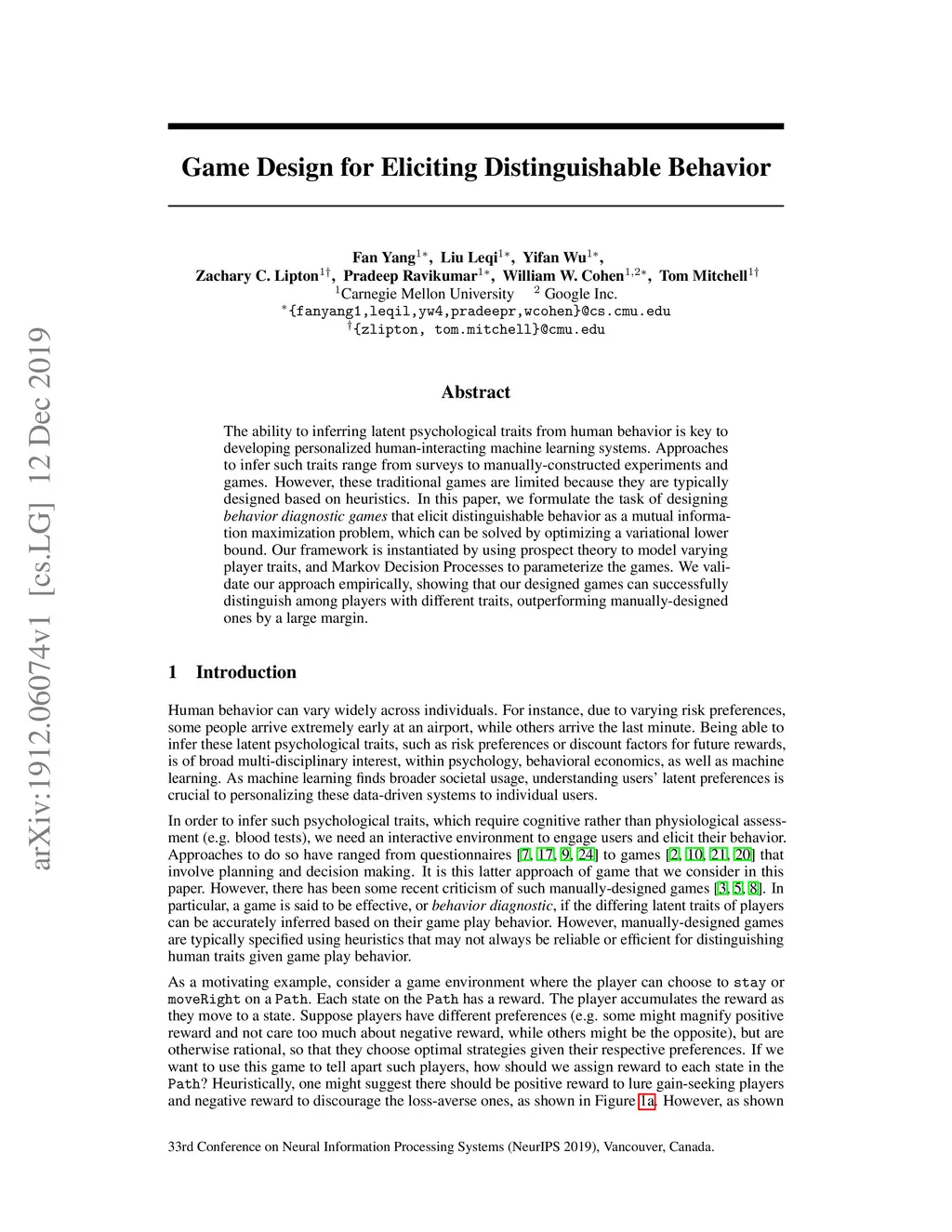 The ability to inferring latent psychological traits from human behavior is key to developing personalized human-interacting machine learning systems. Approaches to infer such traits range from surveys to manually-constructed experiments and games. However, these traditional games are limited because they are typically designed based on heuristics. In this paper, we formulate the task of designing \emph{behavior diagnostic games} that elicit distinguishable behavior as a mutual information maximization problem, which can be solved by optimizing a variational lower bound. Our framework is instantiated by using prospect theory to model varying player traits, and Markov Decision Processes to parameterize the games. We validate our approach empirically, showing that our designed games can successfully distinguish among players with different traits, outperforming manually-designed ones by a large margin.