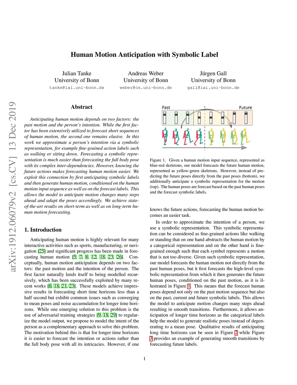 Anticipating human motion depends on two factors: the past motion and the person's intention. While the first factor has been extensively utilized to forecast short sequences of human motion, the second one remains elusive. In this work we approximate a person's intention via a symbolic representation, for example fine-grained action labels such as walking or sitting down. Forecasting a symbolic representation is much easier than forecasting the full body pose with its complex inter-dependencies. However, knowing the future actions makes forecasting human motion easier. We exploit this connection by first anticipating symbolic labels and then generate human motion, conditioned on the human motion input sequence as well as on the forecast labels. This allows the model to anticipate motion changes many steps ahead and adapt the poses accordingly. We achieve state-of-the-art results on short-term as well as on long-term human motion forecasting.