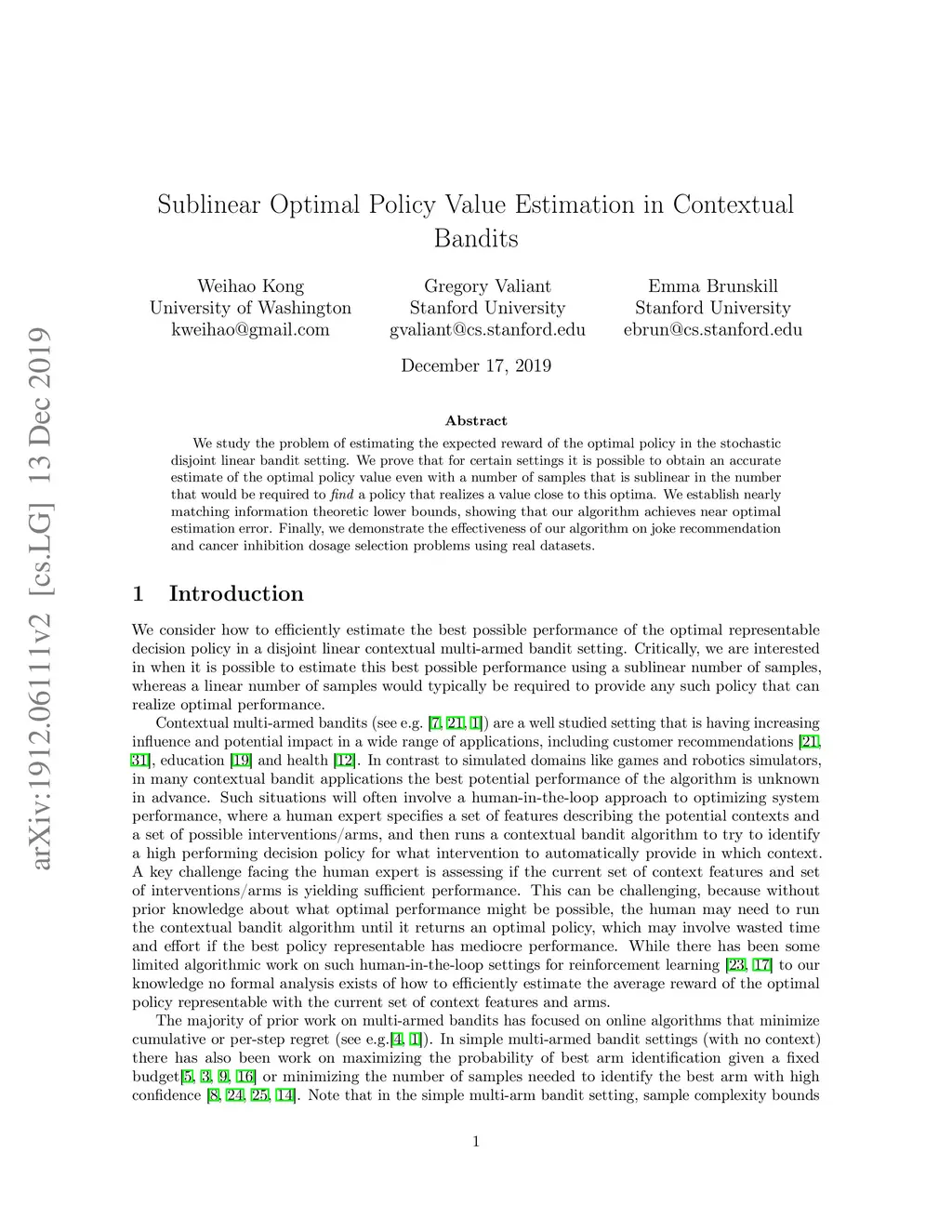 We study the problem of estimating the expected reward of the optimal policy in the stochastic disjoint linear bandit setting. We prove that for certain settings it is possible to obtain an accurate estimate of the optimal policy value even with a number of samples that is sublinear in the number that would be required to \emph{find} a policy that realizes a value close to this optima. We establish nearly matching information theoretic lower bounds, showing that our algorithm achieves near optimal estimation error. Finally, we demonstrate the effectiveness of our algorithm on joke recommendation and cancer inhibition dosage selection problems using real datasets.