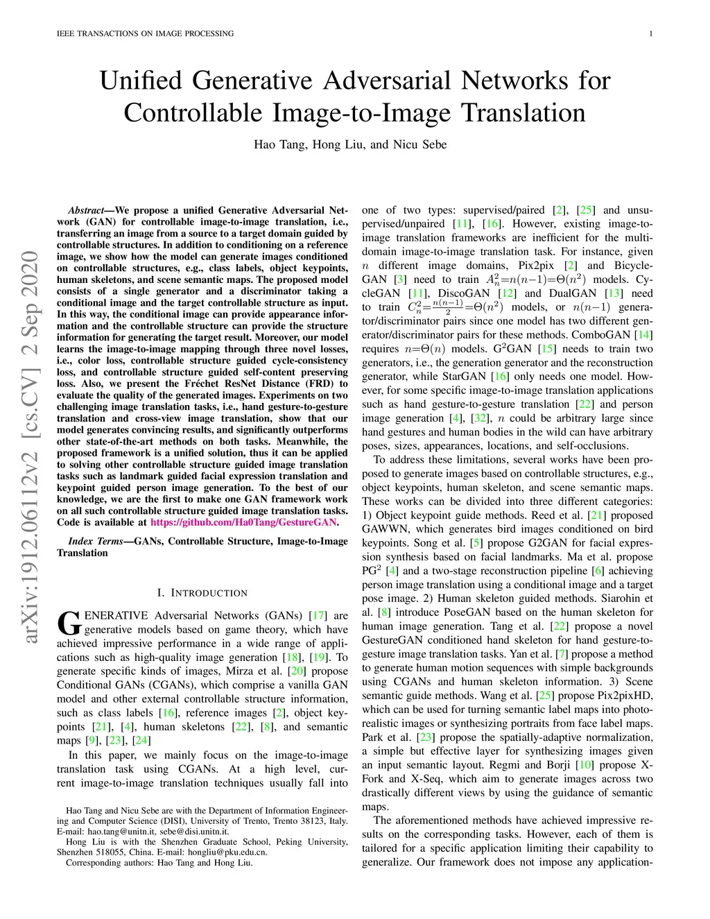 We propose a unified Generative Adversarial Network (GAN) for controllable image-to-image translation, i.e., transferring an image from a source to a target domain guided by controllable structures. In addition to conditioning on a reference image, we show how the model can generate images conditioned on controllable structures, e.g., class labels, object keypoints, human skeletons, and scene semantic maps. The proposed model consists of a single generator and a discriminator taking a conditional image and the target controllable structure as input. In this way, the conditional image can provide appearance information and the controllable structure can provide the structure information for generating the target result. Moreover, our model learns the image-to-image mapping through three novel losses, i.e., color loss, controllable structure guided cycle-consistency loss, and controllable structure guided self-content preserving loss. Also, we present the Fr\échet ResNet Distance (FRD) to evaluate the quality of the generated images. Experiments on two challenging image translation tasks, i.e., hand gesture-to-gesture translation and cross-view image translation, show that our model generates convincing results, and significantly outperforms other state-of-the-art methods on both tasks. Meanwhile, the proposed framework is a unified solution, thus it can be applied to solving other controllable structure guided image translation tasks such as landmark guided facial expression translation and keypoint guided person image generation. To the best of our knowledge, we are the first to make one GAN framework work on all such controllable structure guided image translation tasks. Code is available at https://github.com/Ha0Tang/GestureGAN.