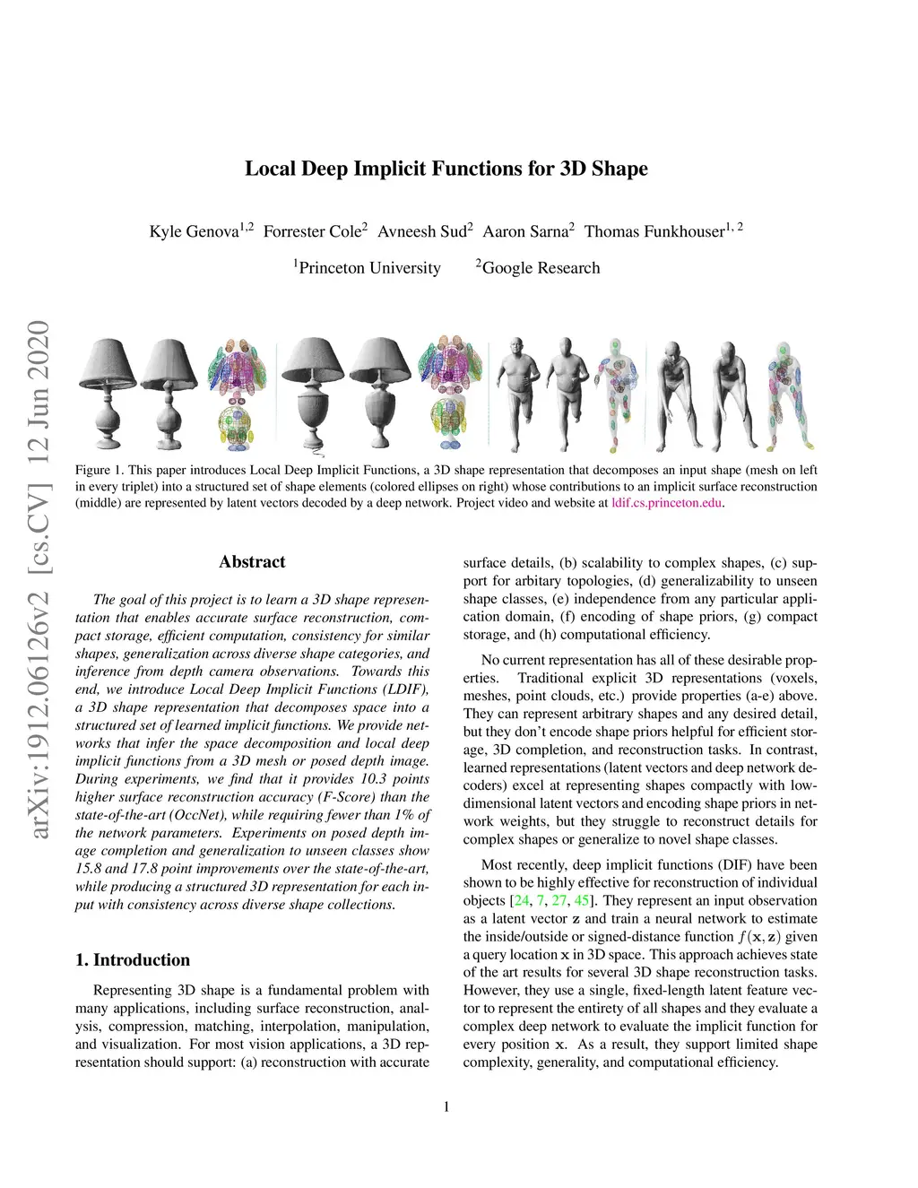 The goal of this project is to learn a 3D shape representation that enables accurate surface reconstruction, compact storage, efficient computation, consistency for similar shapes, generalization across diverse shape categories, and inference from depth camera observations. Towards this end, we introduce Local Deep Implicit Functions (LDIF), a 3D shape representation that decomposes space into a structured set of learned implicit functions. We provide networks that infer the space decomposition and local deep implicit functions from a 3D mesh or posed depth image. During experiments, we find that it provides 10.3 points higher surface reconstruction accuracy (F-Score) than the state-of-the-art (OccNet), while requiring fewer than 1 percent of the network parameters. Experiments on posed depth image completion and generalization to unseen classes show 15.8 and 17.8 point improvements over the state-of-the-art, while producing a structured 3D representation for each input with consistency across diverse shape collections.