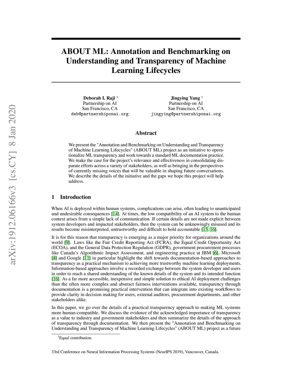 We present the "Annotation and Benchmarking on Understanding and Transparency of Machine Learning Lifecycles" (ABOUT ML) project as an initiative to operationalize ML transparency and work towards a standard ML documentation practice. We make the case for the project's relevance and effectiveness in consolidating disparate efforts across a variety of stakeholders, as well as bringing in the perspectives of currently missing voices that will be valuable in shaping future conversations. We describe the details of the initiative and the gaps we hope this project will help address.