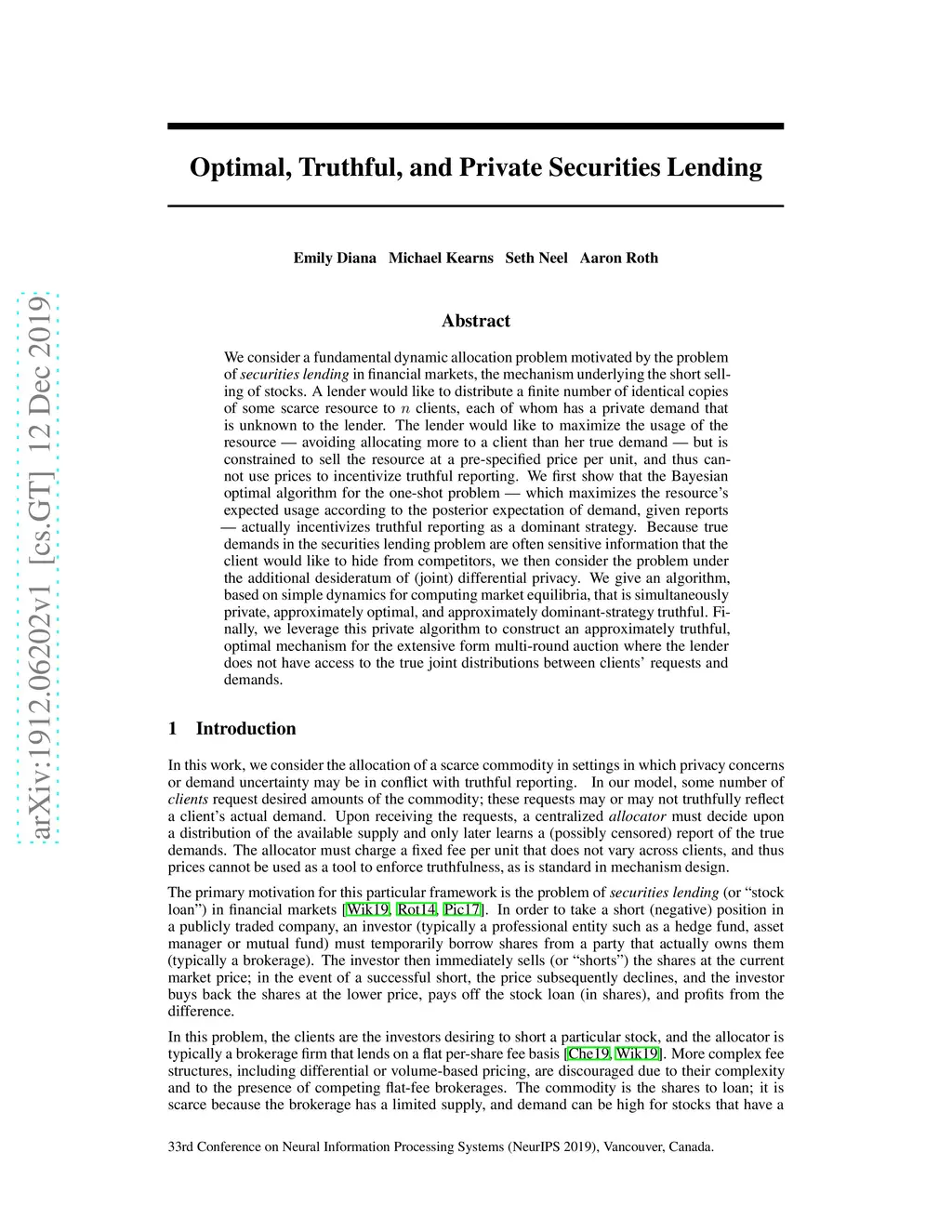We consider a fundamental dynamic allocation problem motivated by the problem of in financial markets, the mechanism underlying the short selling of stocks. A lender would like to distribute a finite number of identical copies of some scarce resource to clients, each of whom has a private demand that is unknown to the lender. The lender would like to maximize the usage of the resource avoiding allocating more to a client than her true demand but is constrained to sell the resource at a pre-specified price per unit, and thus cannot use prices to incentivize truthful reporting. We first show that the Bayesian optimal algorithm for the one-shot problem which maximizes the resource's expected usage according to the posterior expectation of demand, given reports actually incentivizes truthful reporting as a dominant strategy. Because true demands in the securities lending problem are often sensitive information that the client would like to hide from competitors, we then consider the problem under the additional desideratum of (joint) differential privacy. We give an algorithm, based on simple dynamics for computing market equilibria, that is simultaneously private, approximately optimal, and approximately dominant-strategy truthful. Finally, we leverage this private algorithm to construct an approximately truthful, optimal mechanism for the extensive form multi-round auction where the lender does not have access to the true joint distributions between clients' requests and demands.