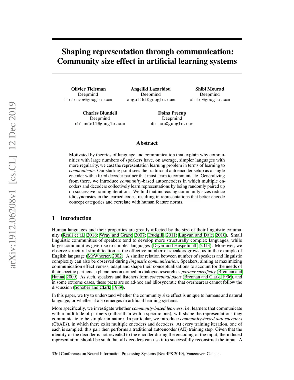 Motivated by theories of language and communication that explain why communities with large numbers of speakers have, on average, simpler languages with more regularity, we cast the representation learning problem in terms of learning to communicate. Our starting point sees the traditional autoencoder setup as a single encoder with a fixed decoder partner that must learn to communicate. Generalizing from there, we introduce community-based autoencoders in which multiple encoders and decoders collectively learn representations by being randomly paired up on successive training iterations. We find that increasing community sizes reduce idiosyncrasies in the learned codes, resulting in representations that better encode concept categories and correlate with human feature norms.
