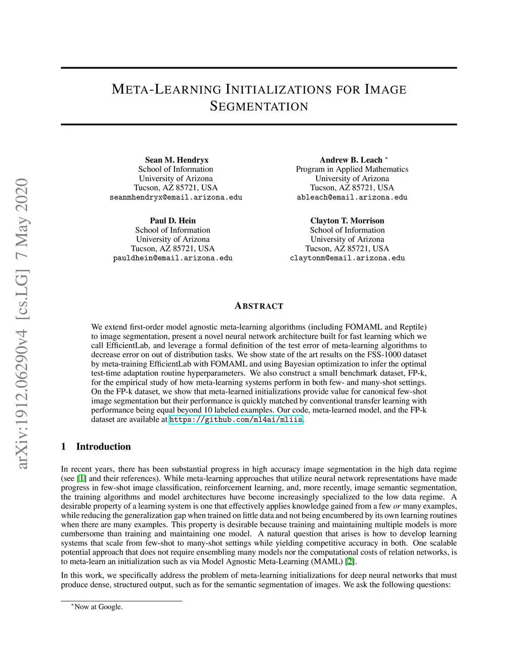 We extend first-order model agnostic meta-learning algorithms (including FOMAML and Reptile) to image segmentation, present a novel neural network architecture built for fast learning which we call EfficientLab, and leverage a formal definition of the test error of meta-learning algorithms to decrease error on out of distribution tasks. We show state of the art results on the FSS-1000 dataset by meta-training EfficientLab with FOMAML and using Bayesian optimization to infer the optimal test-time adaptation routine hyperparameters. We also construct a small benchmark dataset, FP-k, for the empirical study of how meta-learning systems perform in both few- and many-shot settings. On the FP-k dataset, we show that meta-learned initializations provide value for canonical few-shot image segmentation but their performance is quickly matched by conventional transfer learning with performance being equal beyond 10 labeled examples. Our code, meta-learned model, and the FP-k dataset are available at https://github.com/ml4ai/mliis .