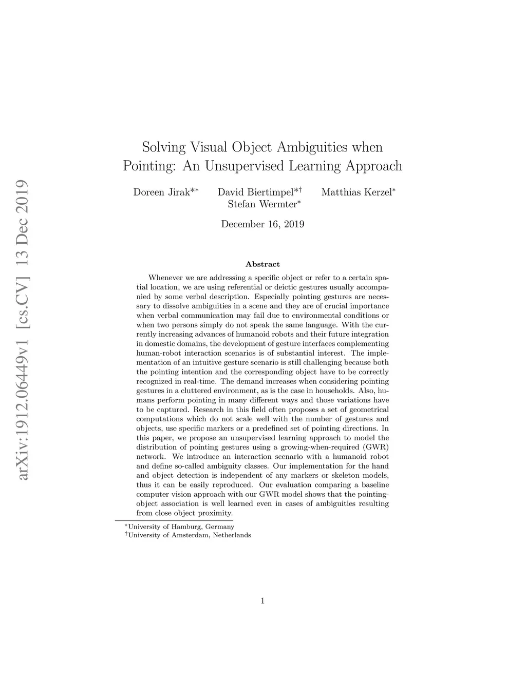 Whenever we are addressing a specific object or refer to a certain spatial location, we are using referential or deictic gestures usually accompanied by some verbal description. Especially pointing gestures are necessary to dissolve ambiguities in a scene and they are of crucial importance when verbal communication may fail due to environmental conditions or when two persons simply do not speak the same language. With the currently increasing advances of humanoid robots and their future integration in domestic domains, the development of gesture interfaces complementing human-robot interaction scenarios is of substantial interest. The implementation of an intuitive gesture scenario is still challenging because both the pointing intention and the corresponding object have to be correctly recognized in real-time. The demand increases when considering pointing gestures in a cluttered environment, as is the case in households. Also, humans perform pointing in many different ways and those variations have to be captured. Research in this field often proposes a set of geometrical computations which do not scale well with the number of gestures and objects, use specific markers or a predefined set of pointing directions. In this paper, we propose an unsupervised learning approach to model the distribution of pointing gestures using a growing-when-required (GWR) network. We introduce an interaction scenario with a humanoid robot and define so-called ambiguity classes. Our implementation for the hand and object detection is independent of any markers or skeleton models, thus it can be easily reproduced. Our evaluation comparing a baseline computer vision approach with our GWR model shows that the pointing-object association is well learned even in cases of ambiguities resulting from close object proximity.