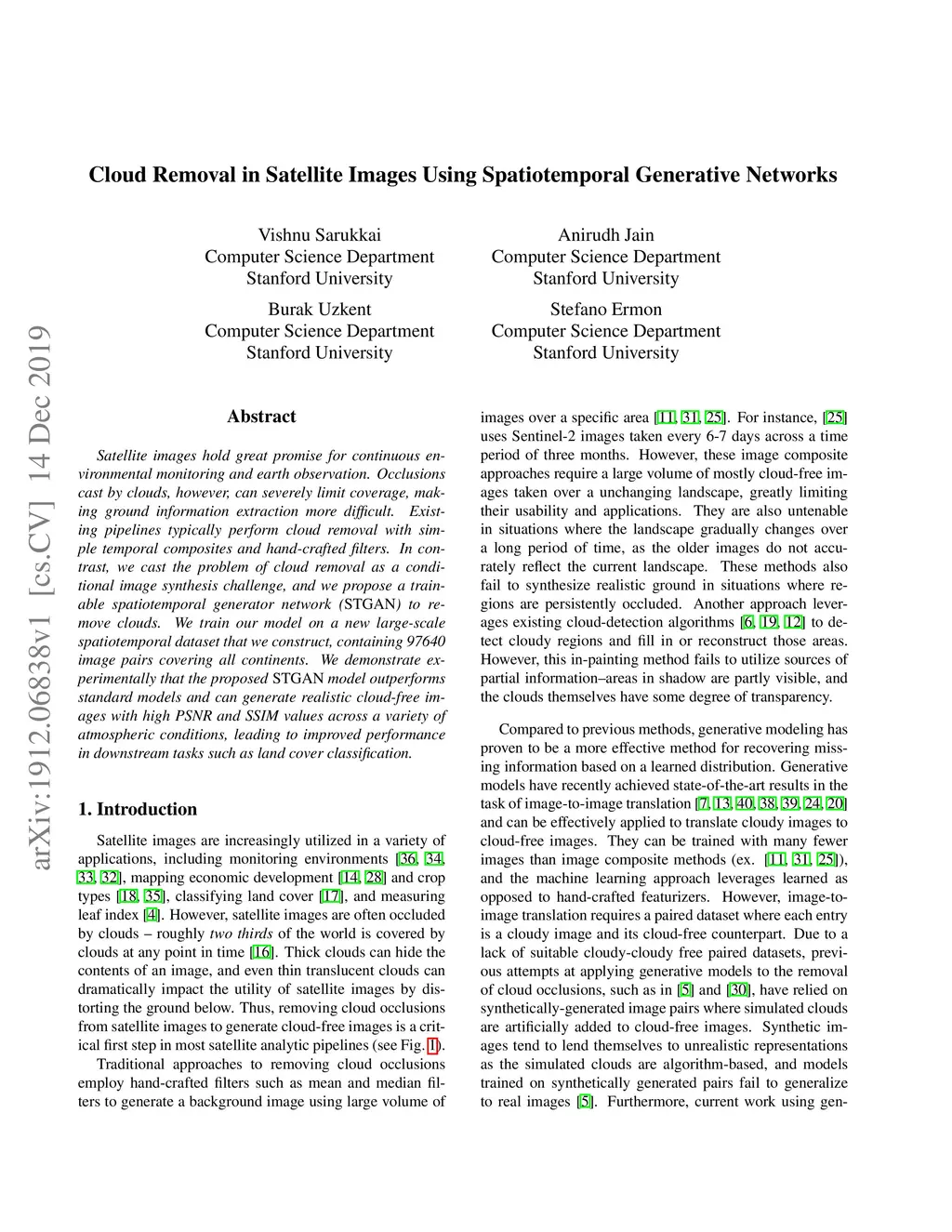 Satellite images hold great promise for continuous environmental monitoring and earth observation. Occlusions cast by clouds, however, can severely limit coverage, making ground information extraction more difficult. Existing pipelines typically perform cloud removal with simple temporal composites and hand-crafted filters. In contrast, we cast the problem of cloud removal as a conditional image synthesis challenge, and we propose a trainable spatiotemporal generator network (STGAN) to remove clouds. We train our model on a new large-scale spatiotemporal dataset that we construct, containing 97640 image pairs covering all continents. We demonstrate experimentally that the proposed STGAN model outperforms standard models and can generate realistic cloud-free images with high PSNR and SSIM values across a variety of atmospheric conditions, leading to improved performance in downstream tasks such as land cover classification.