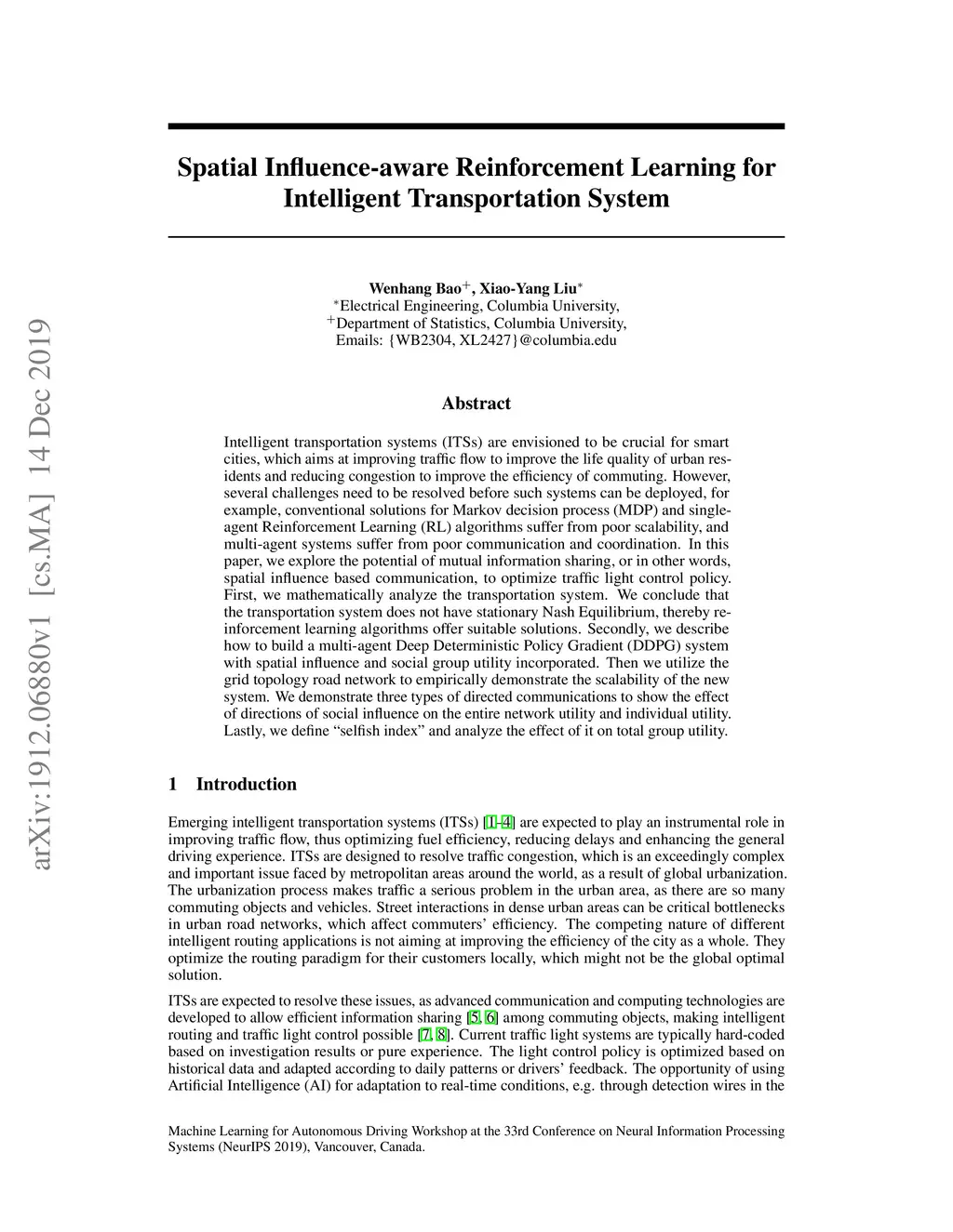 Intelligent transportation systems (ITSs) are envisioned to be crucial for smart cities, which aims at improving traffic flow to improve the life quality of urban residents and reducing congestion to improve the efficiency of commuting. However, several challenges need to be resolved before such systems can be deployed, for example, conventional solutions for Markov decision process (MDP) and single-agent Reinforcement Learning (RL) algorithms suffer from poor scalability, and multi-agent systems suffer from poor communication and coordination. In this paper, we explore the potential of mutual information sharing, or in other words, spatial influence based communication, to optimize traffic light control policy. First, we mathematically analyze the transportation system. We conclude that the transportation system does not have stationary Nash Equilibrium, thereby reinforcement learning algorithms offer suitable solutions. Secondly, we describe how to build a multi-agent Deep Deterministic Policy Gradient (DDPG) system with spatial influence and social group utility incorporated. Then we utilize the grid topology road network to empirically demonstrate the scalability of the new system. We demonstrate three types of directed communications to show the effect of directions of social influence on the entire network utility and individual utility. Lastly, we define "selfish index" and analyze the effect of it on total group utility.