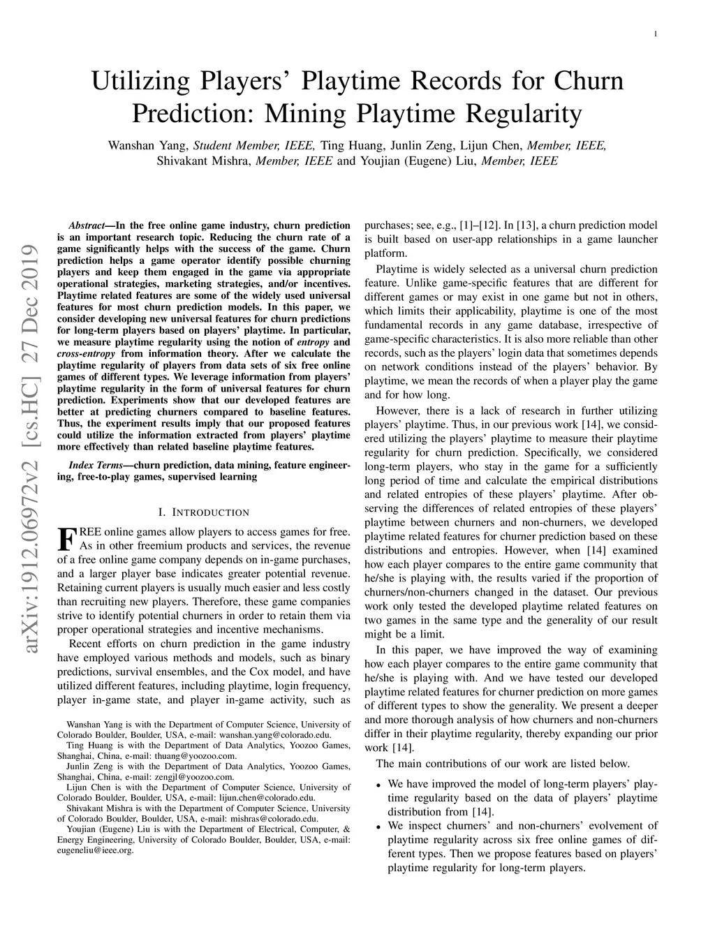 In the free online game industry, churn prediction is an important research topic. Reducing the churn rate of a game significantly helps with the success of the game. Churn prediction helps a game operator identify possible churning players and keep them engaged in the game via appropriate operational strategies, marketing strategies, and/or incentives. Playtime related features are some of the widely used universal features for most churn prediction models. In this paper, we consider developing new universal features for churn predictions for long-term players based on players' playtime.