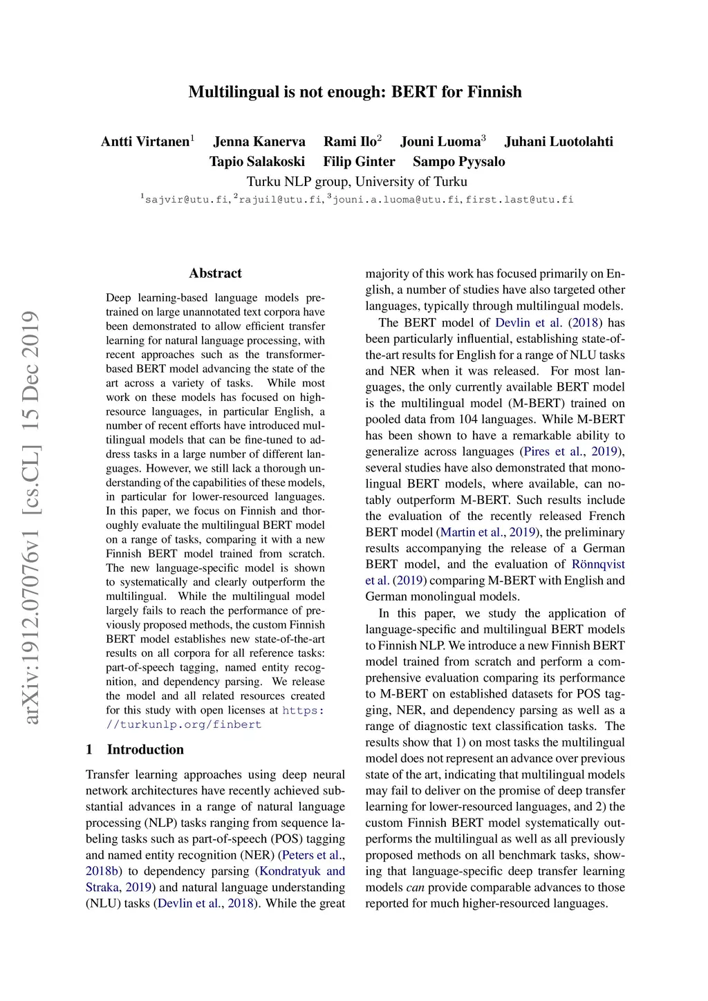 Deep learning-based language models pretrained on large unannotated text corpora have been demonstrated to allow efficient transfer learning for natural language processing, with recent approaches such as the transformer-based BERT model advancing the state of the art across a variety of tasks. While most work on these models has focused on high-resource languages, in particular English, a number of recent efforts have introduced multilingual models that can be fine-tuned to address tasks in a large number of different languages. However, we still lack a thorough understanding of the capabilities of these models, in particular for lower-resourced languages. In this paper, we focus on Finnish and thoroughly evaluate the multilingual BERT model on a range of tasks, comparing it with a new Finnish BERT model trained from scratch. The new language-specific model is shown to systematically and clearly outperform the multilingual. While the multilingual model largely fails to reach the performance of previously proposed methods, the custom Finnish BERT model establishes new state-of-the-art results on all corpora for all reference tasks: part-of-speech tagging, named entity recognition, and dependency parsing. We release the model and all related resources created for this study with open licenses at https://turkunlp.org/finbert .
